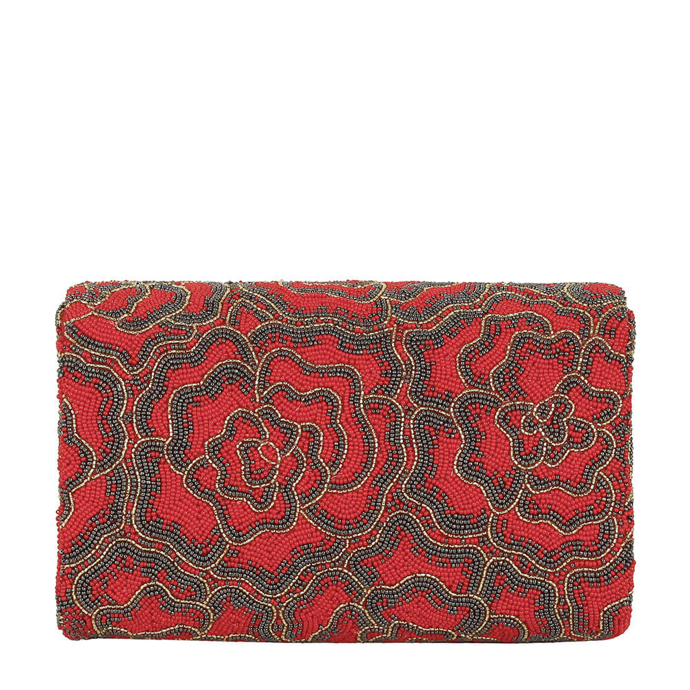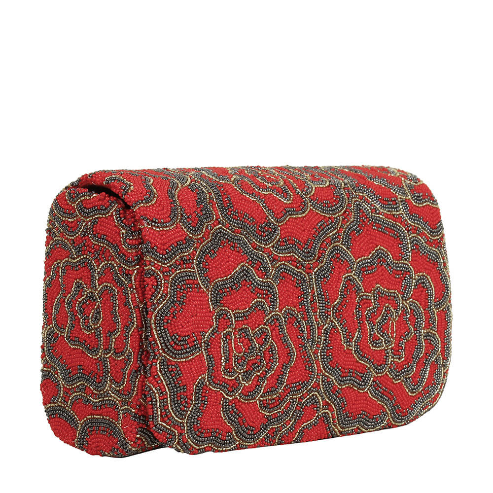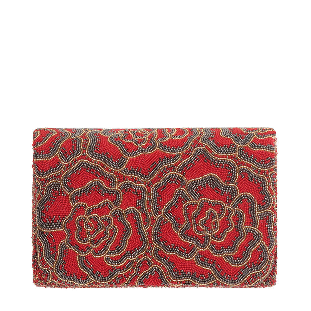 This flapover clutch is intricately hand embroidered with fine Japanese seed beads.The pattern reflects the exuberance of roses with an ombre’ effect.