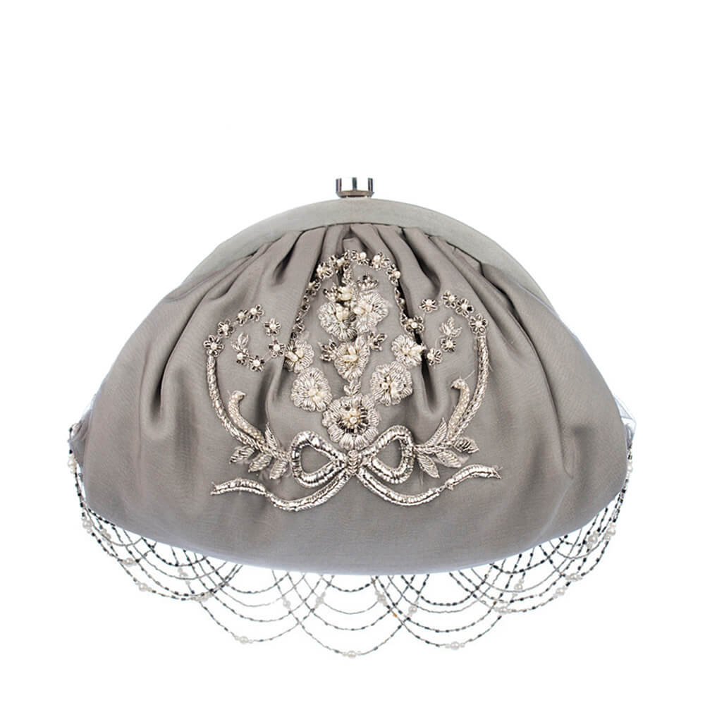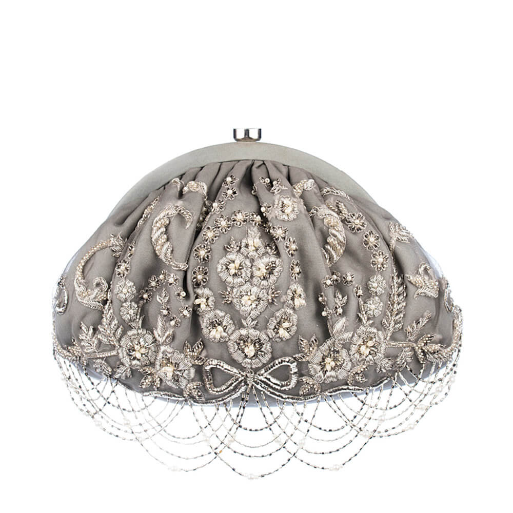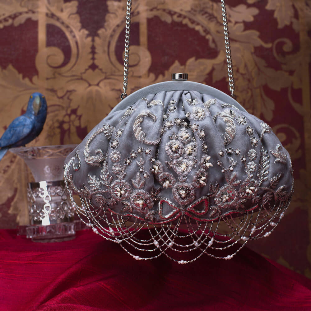Inspired by the opulence of the golden period in French history called La Belle Epoque, this pouch is intricately hand embroidered with sublime bugle beads,cultured drop pearls and fine gold and silver threads. It has handcrafted chandelier like tassels.