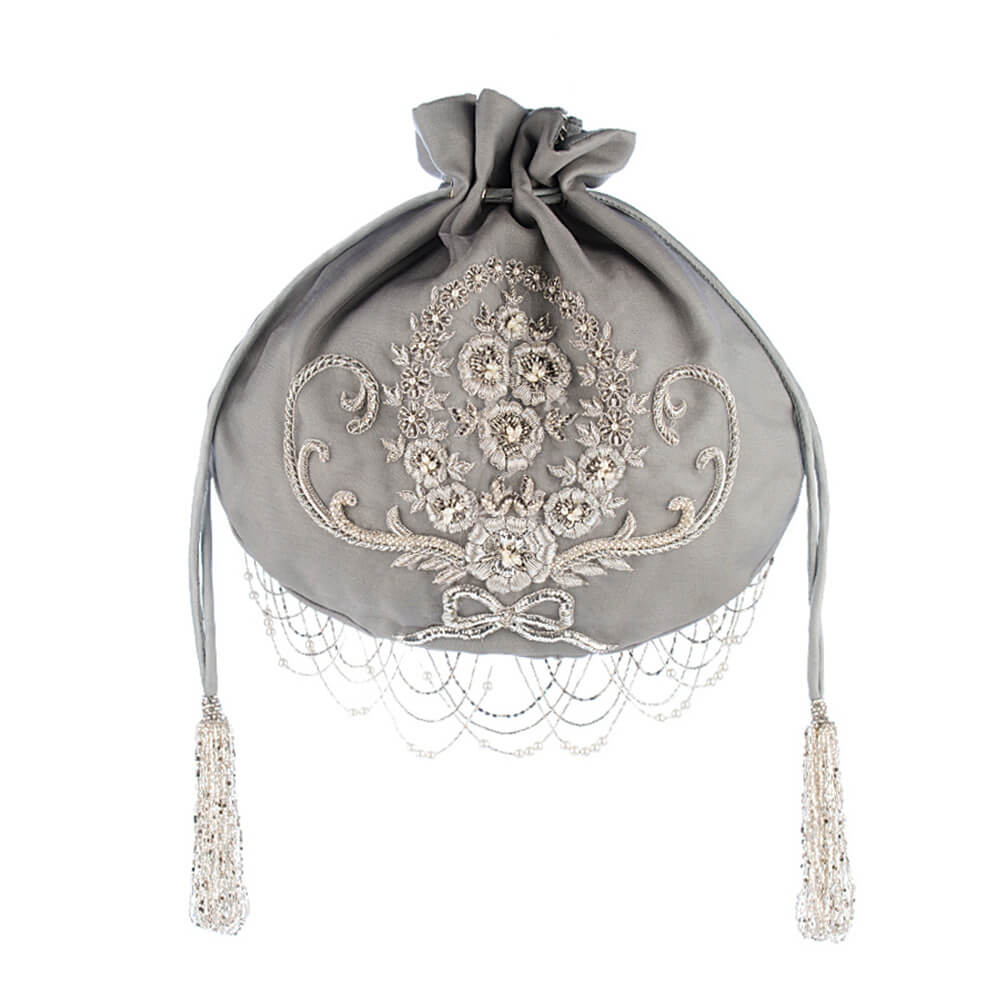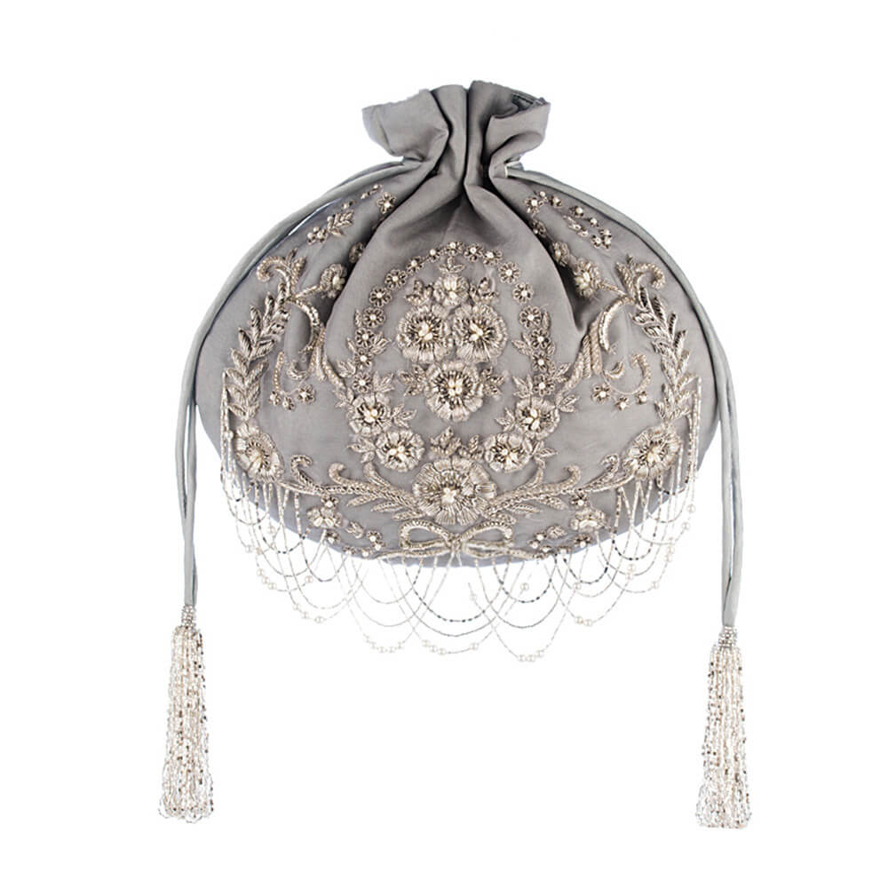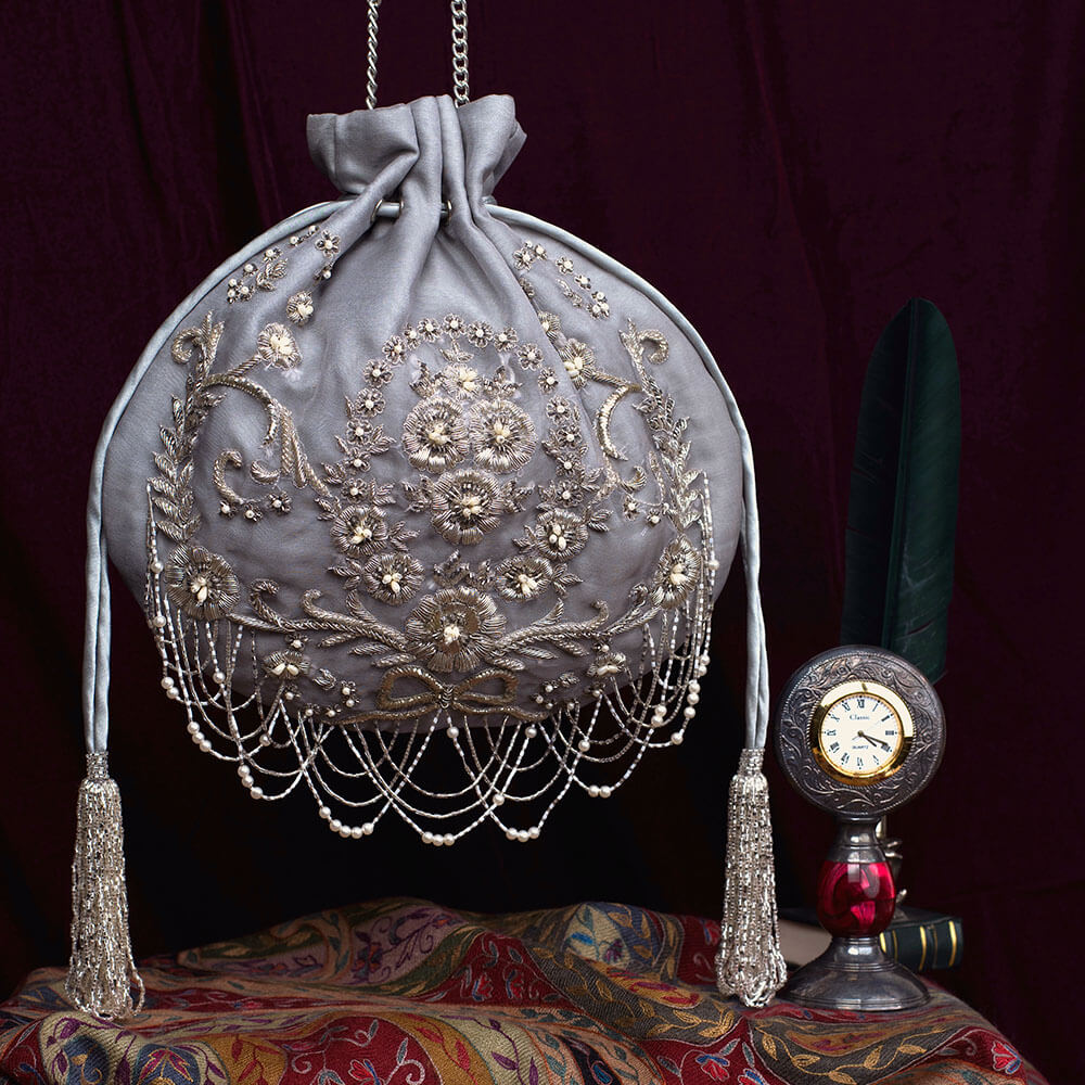 Inspired by the opulence of the golden period in French history called La Belle Epoque, this potli pouch is intricately hand embroidered with sublime bugle beads,cultured drop pearls and fine gold and silver threads.