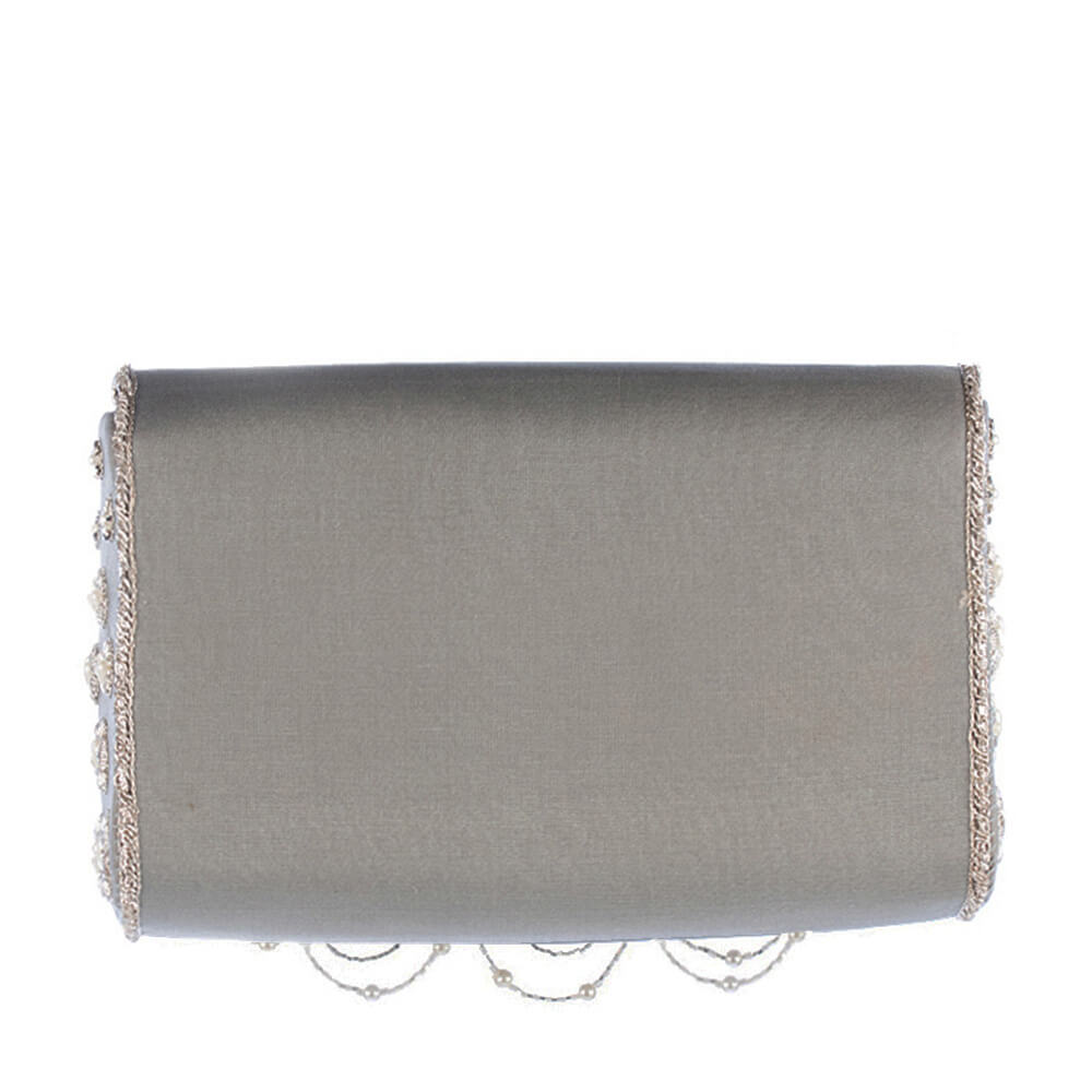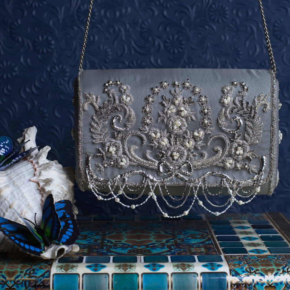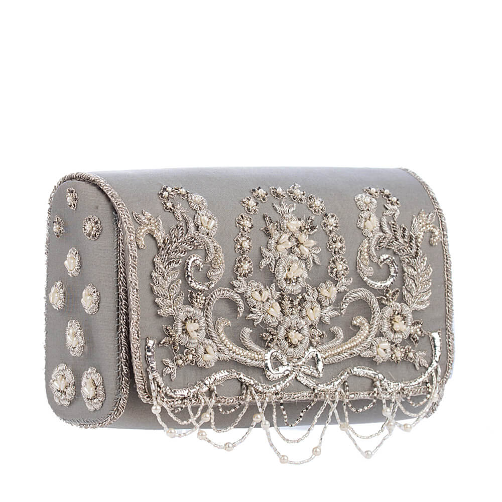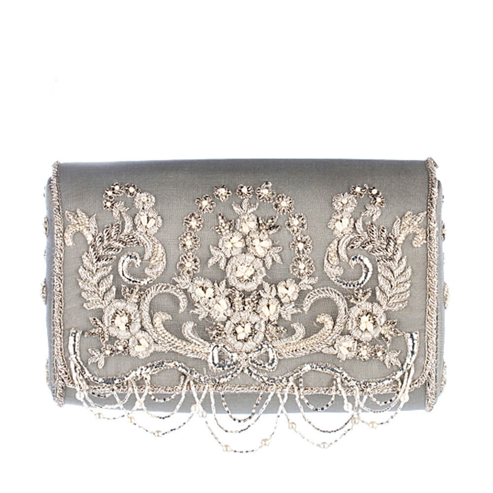 Inspired by the opulence of the golden period in French history called La Belle Epoque, this flapover clutch is intricately hand embroidered with sublime bugle beads,cultured drop pearls and fine gold and silver threads. It has handcrafted chandelier like tassels , a suedette lining and a long detachable chain handle.Color: Jasper Grey CARE: Store in dust bag. Keep away from moisture.DIMENSIONS:18 cm x 13 cm x 7 cm.