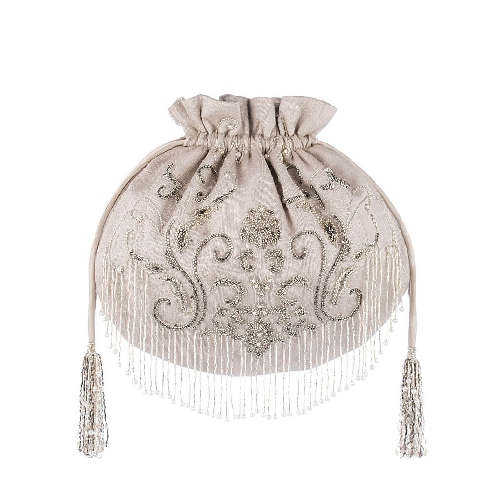 Inspired by the utopian beauty of heritage mughal textiles ,this silk pouch is intricately hand embroidered with fine Japanese bugle beads and cultured ivory pearls . It has hand embellished ‘latkans’ or tassels to recreate the drama of this era.