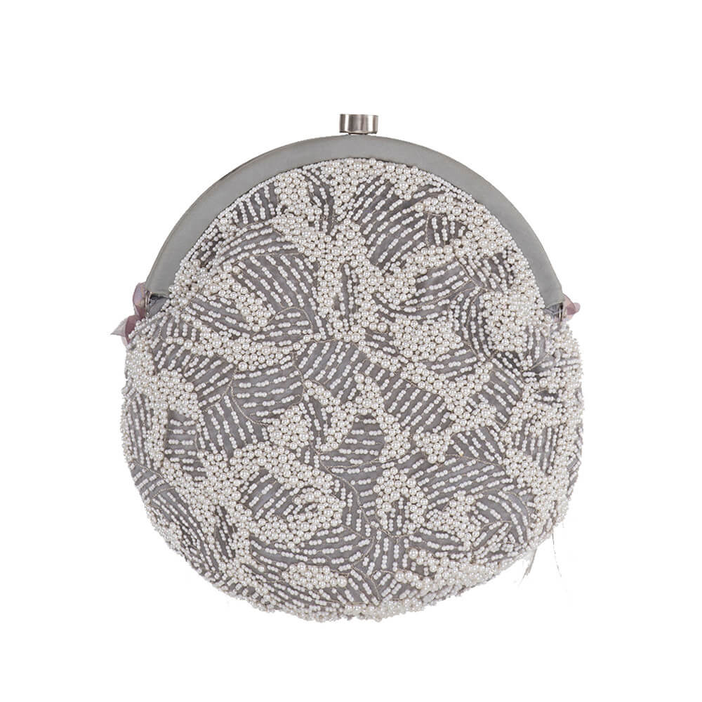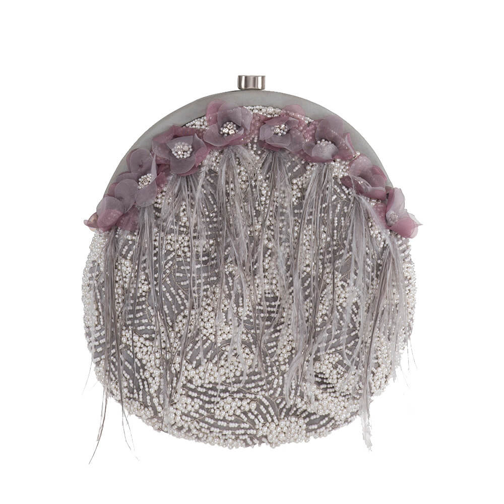 This Frame pouch is delicately hand embroidered with fine pearls , flowers , diamantes and faux feathers. The design reflects a bouquet of blooms on a bed of delicate pearl embellishments.