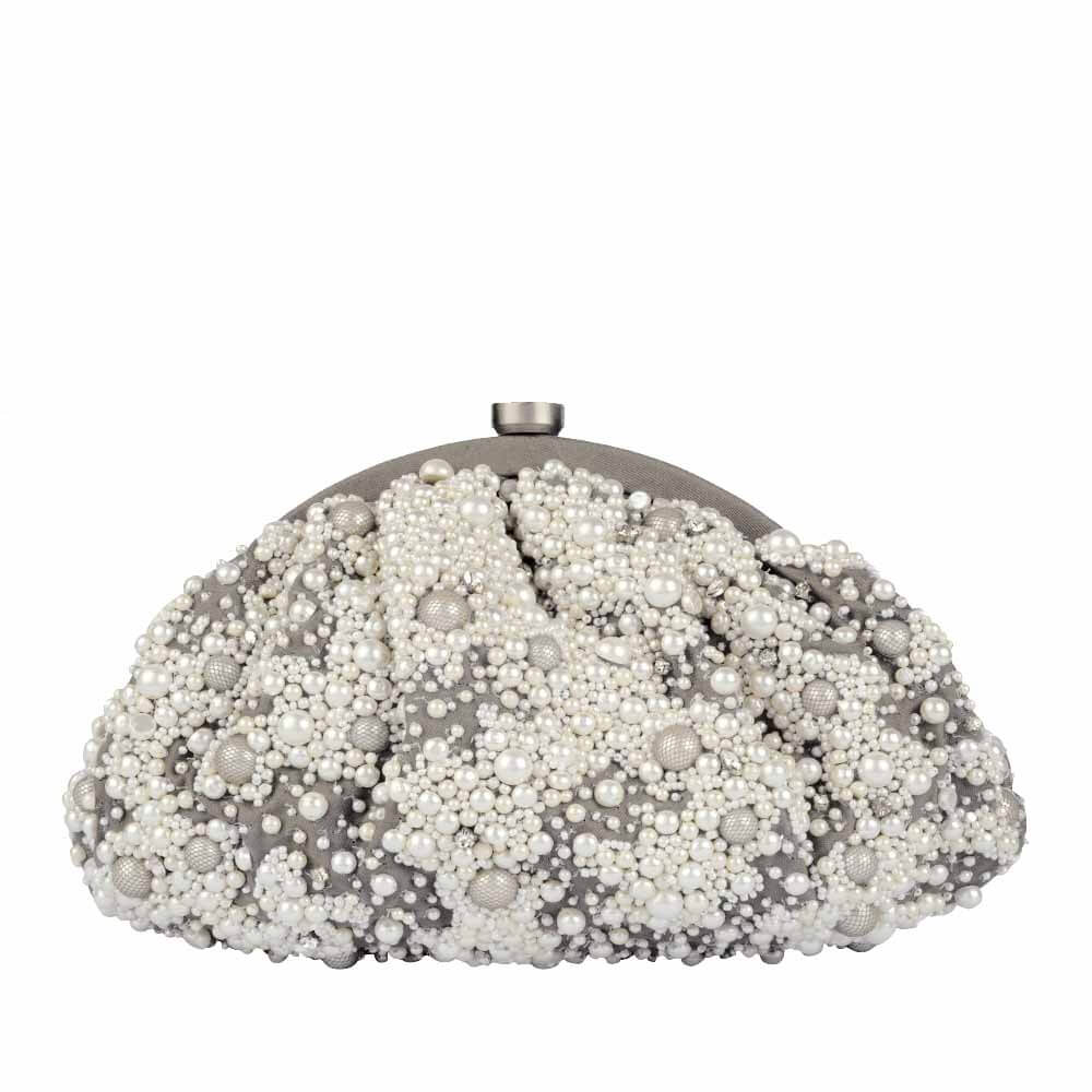 This elegant and classic pearl pouch is delicately hand embroidered with fine japanese beads, pearls and dimantes. It has a suedette lining and a long chain handle .The design is reminiscent of the patterns created by mist and fog in a meditative setting and is symbolic of the idea that all the world's beauty is present right HERE within us. STYLE TIP: Carry with western as well as traditional Indianwear. Style it with plush velvets, satins and silks for a luxe look.