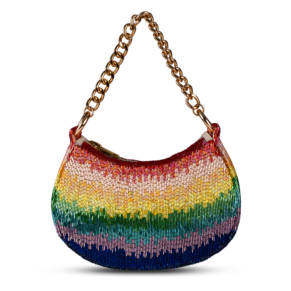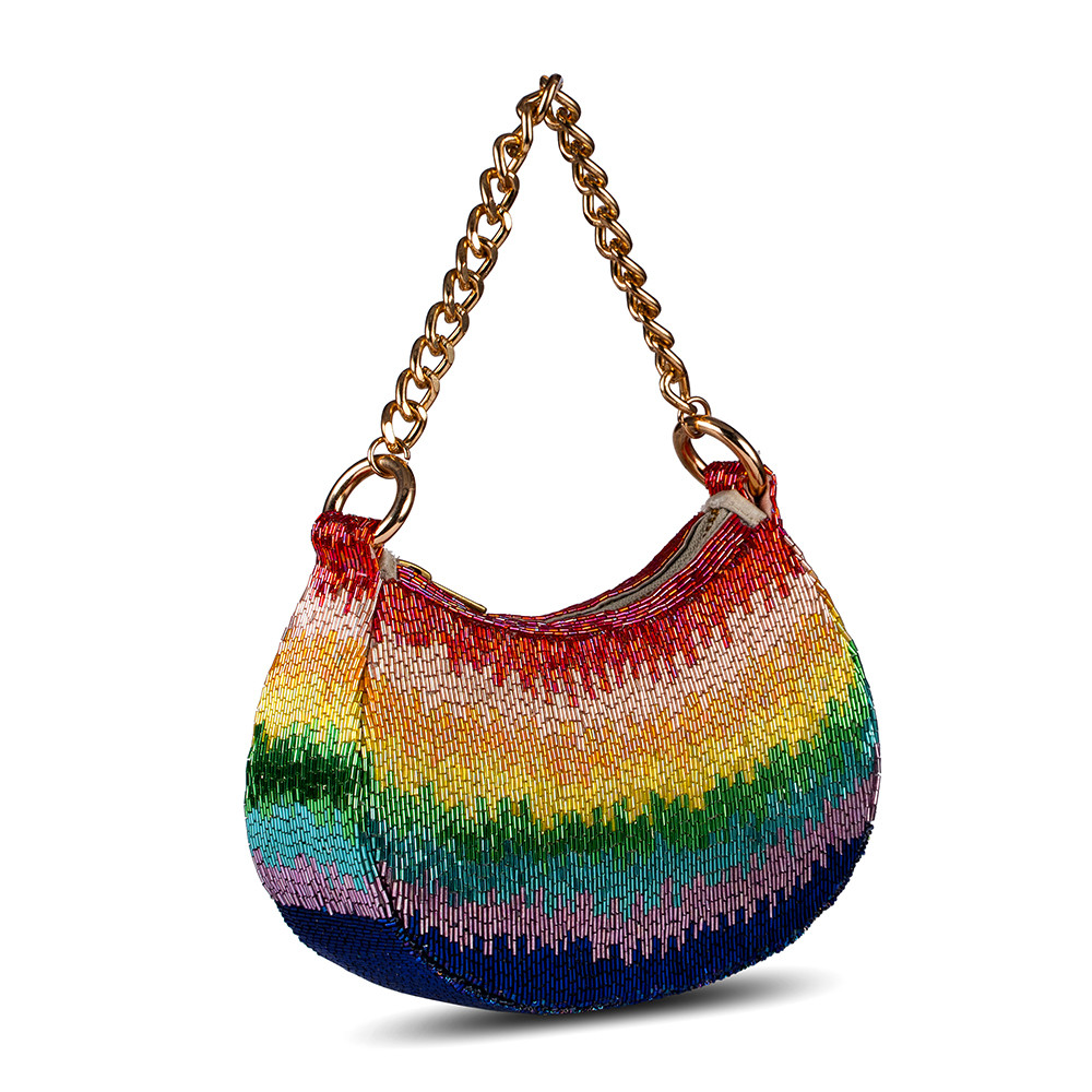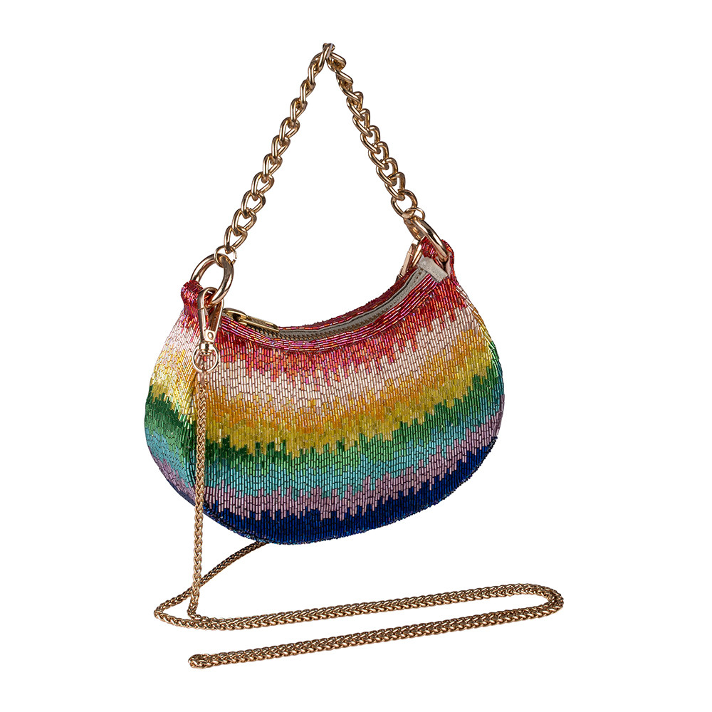 The Dysis Crescent clutch reflects the intricate craft of mosaic art, with fine Japanese bugle beads in Rainbow hues. Designed with both a embellished chain and crossbody chain, it can be carried by hand or worn over the shoulder. perfect for holding makeup, currency, cards and keys, and includes an inside slip pocket for easy organization.