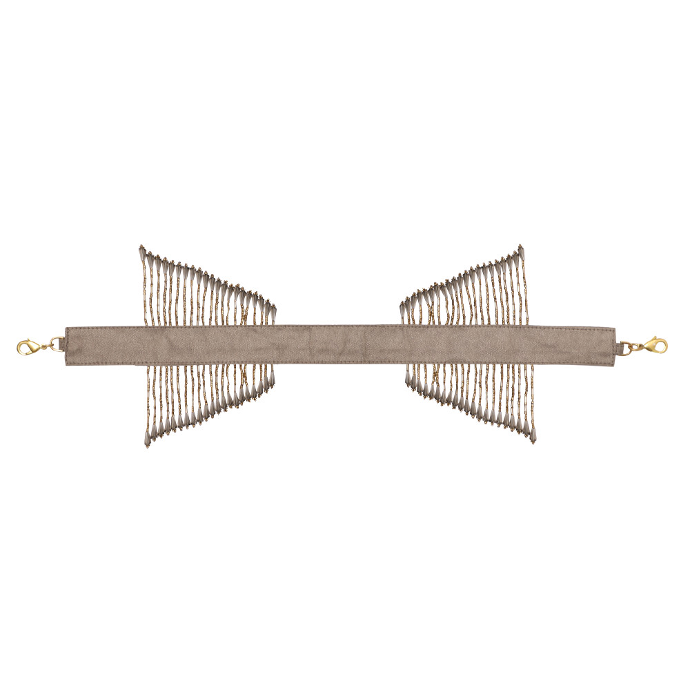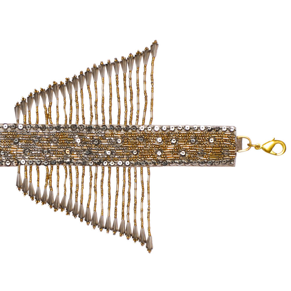 This signature feature handle is delicately hand embroidered with Lustrous Japanese micro beads, crystals and diamanté’. It is a detachable statement add on that grants versatility to any heirloom bag , enabling the opportunity to wear the bag in multiple ways or take it from day to night. With detachable doghooks on both ends, the glittering radiance of the crystal tassels augmentss the playful & youthful demeanour of any bag.