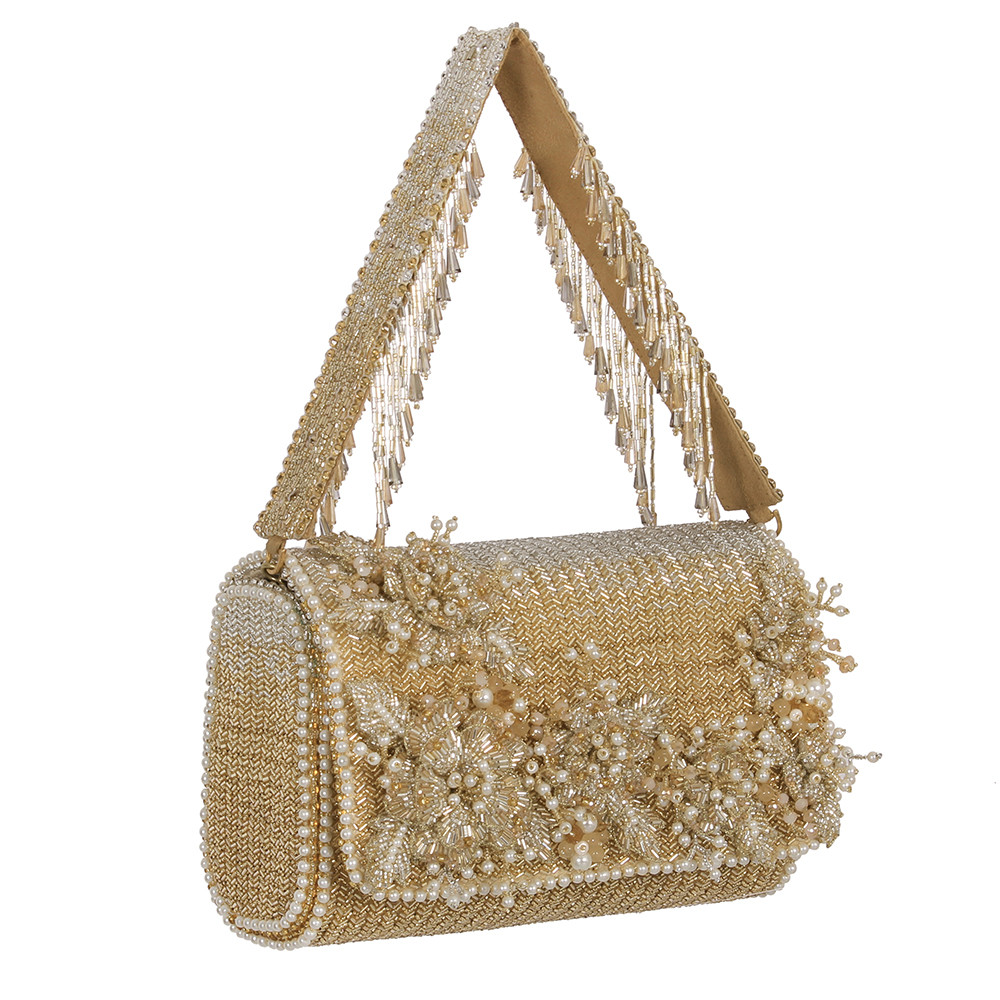 Inspired by a whimsical tropical garden, delicate three dimensional flowers adorn our Esme Flapover Clutch Gold Silver on a textured bed of ombre gold to silver glistening bugle bead. Embellished with gold and silver Japanese beads, rhinestones, semi-precious stones, nuggets, crystals and pearls. The addition of our signature embellished handle makes it a statement accessory.This collectible statement accessory fits in your valuables like a smartphone, makeup, keys, currency and cards.