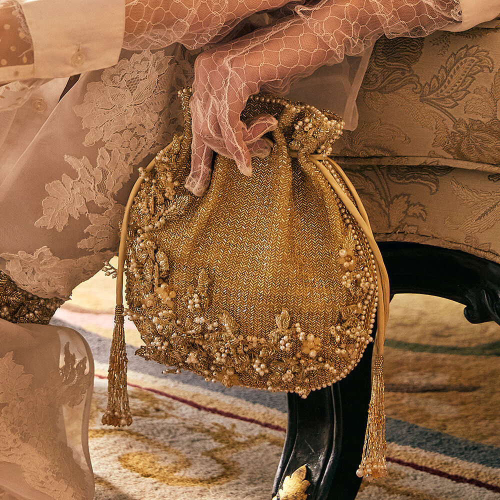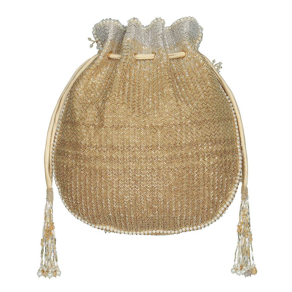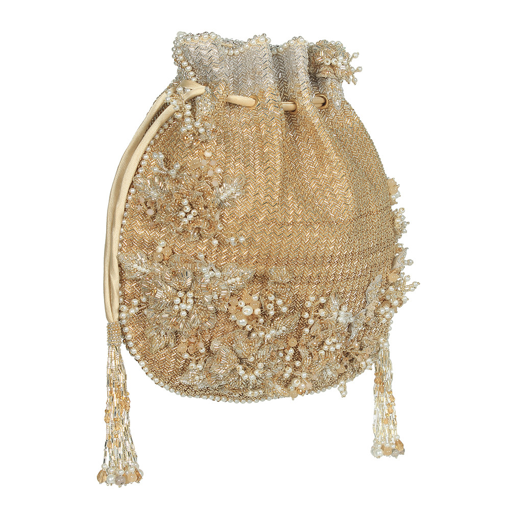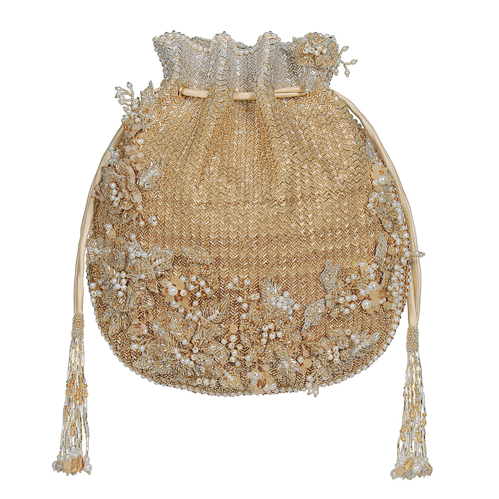 Inspired by a whimsical tropical garden, delicate three dimensional flowers adorn our Esme Potli Pouch Gold Silver on a textured bed of ombre gold to silver glistening bugle bead. Embellished with gold and silver Japanese beads, rhinestones, semi-precious stones, nuggets, crystals and pearls. This collectible statement accessory fits in your valuables like a smartphone, makeup, keys, currency and cards.