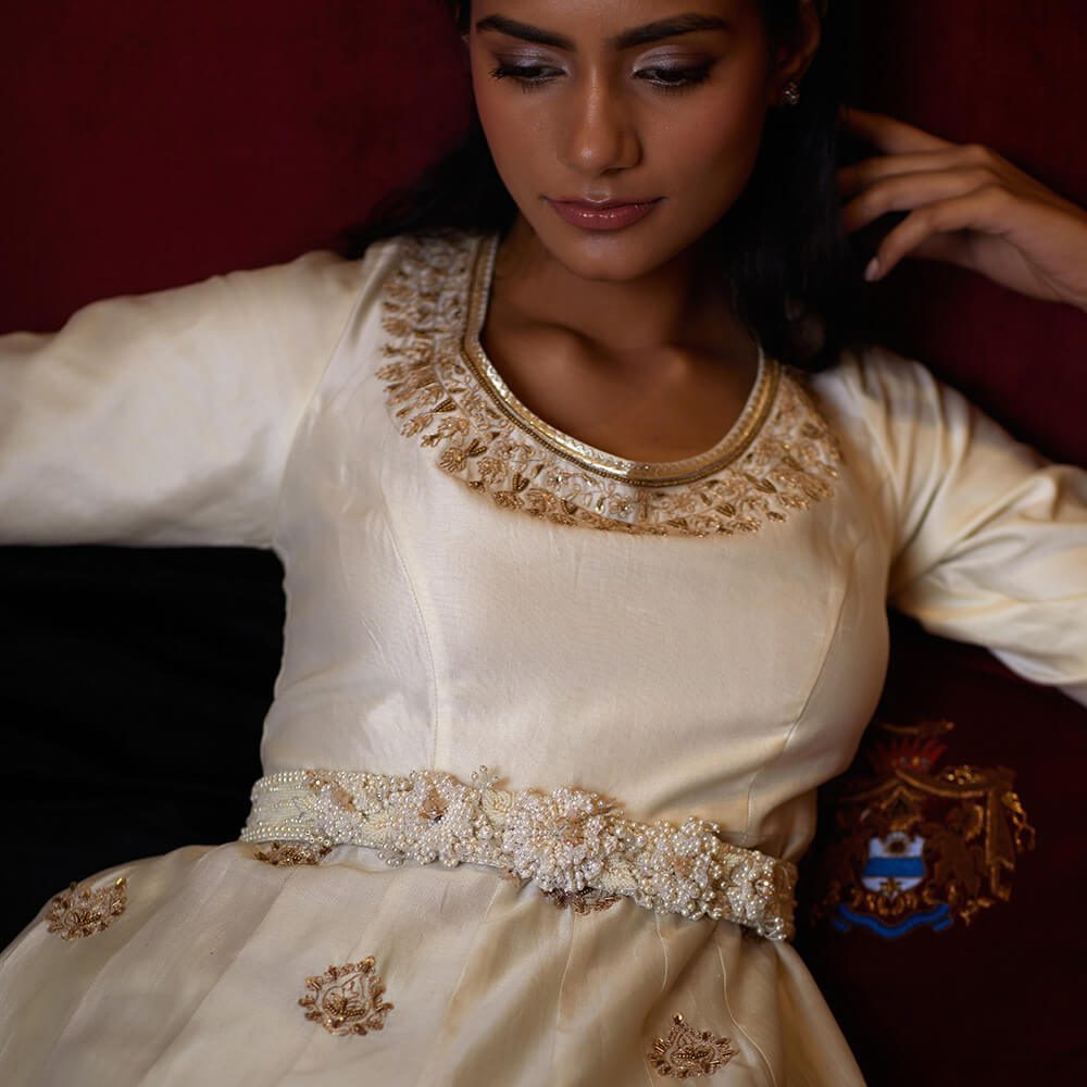 Inspired by a whimsical tropical garden, delicate three dimensional flowers adorn our Esme Waist Belt Ivory on a textured bed of ivory glistening pearls. Embellished with ivory Japanese beads, rhinestones, crystals and glass pearl.