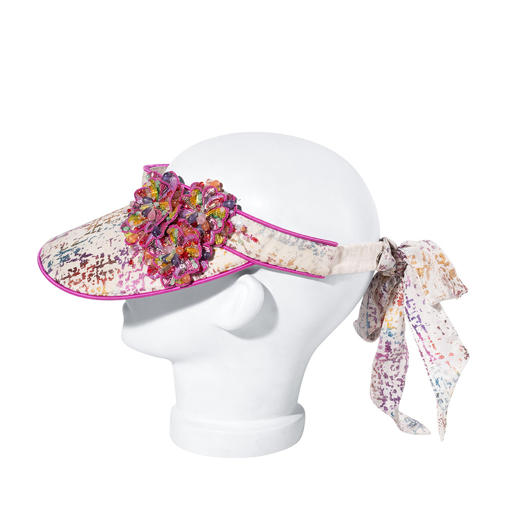 The Fiona Visor in White, with its retro-futuristic flair, is adorned with delicate beaded flowers handcrafted with precision cut Japanese beads, rhinestones, and semi-precious stones in multicolor hues. This chic open-top visor features an adjustable strap and a curved brim, offering both style and sun protection. Perfect for elevating your resort and sundowner party looks, it adds a playful touch to any outfit.