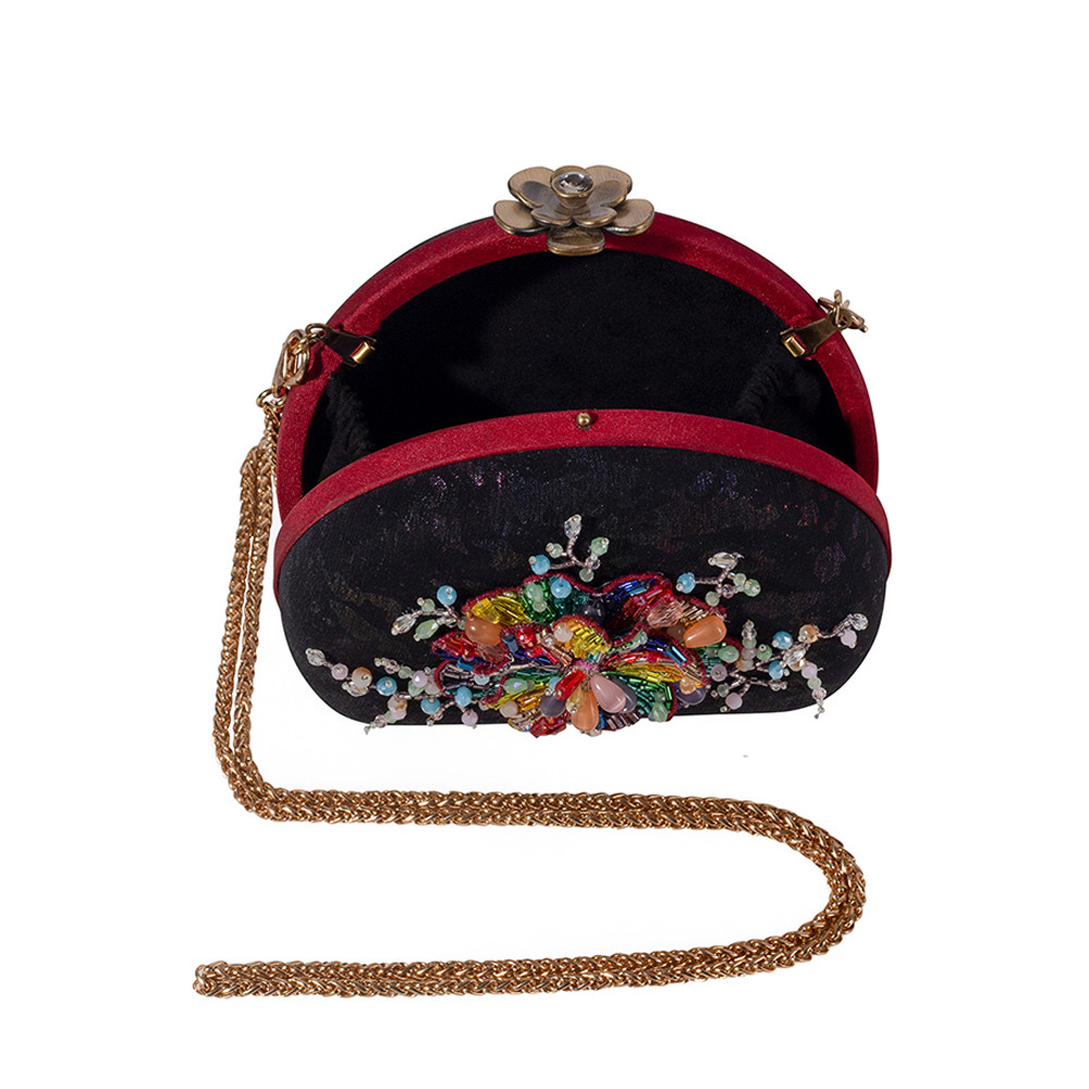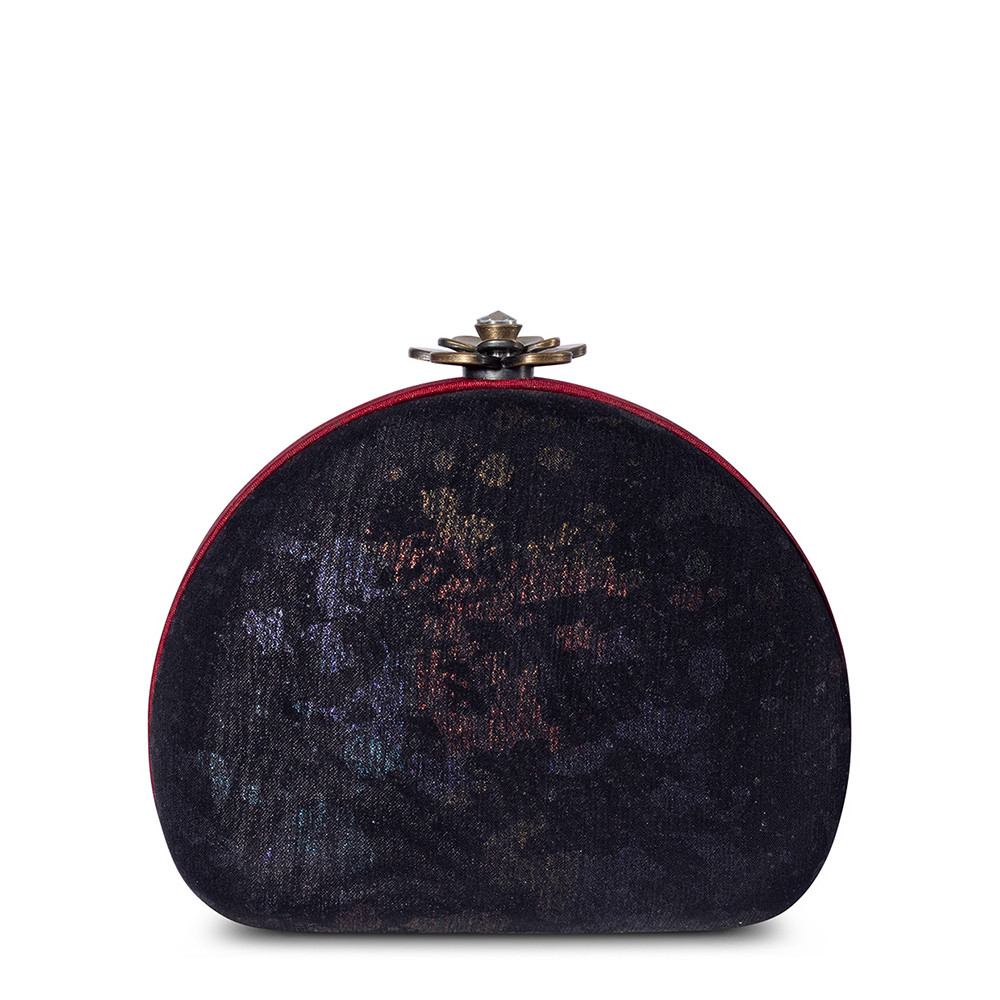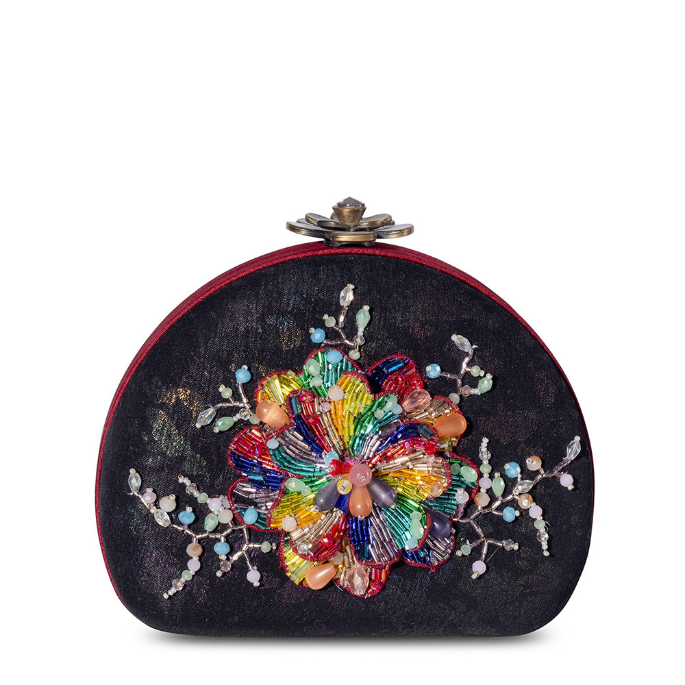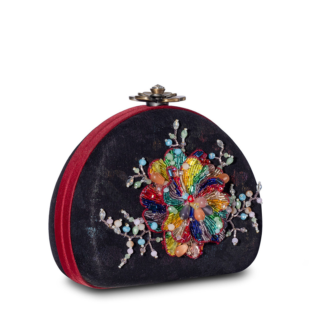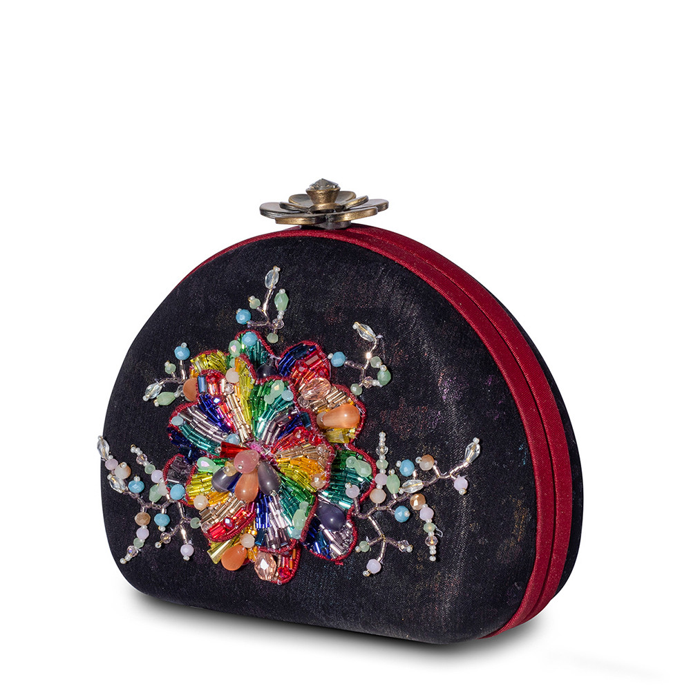 Inspired by a tropical garden with a retro-futuristic aesthetic, this Fiona box mini clutch is beautifully adorned with intricate, beaded flowers handcrafted with precision cut Japanese beads, rhinestones, semi-precious stones, and crystals in multicolor hues. The florals are set against a metallic fabric base, adding a touch of elegance to any look. Lined with soft suedette, it’s perfect for pairing with both western and fusion occasion wear. Designed to fit makeup, currency, cards and keys, and includes an inside slip pocket for easy organization.