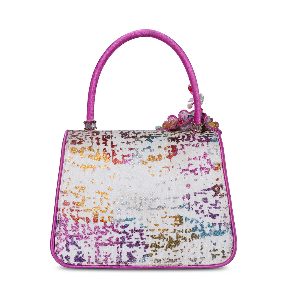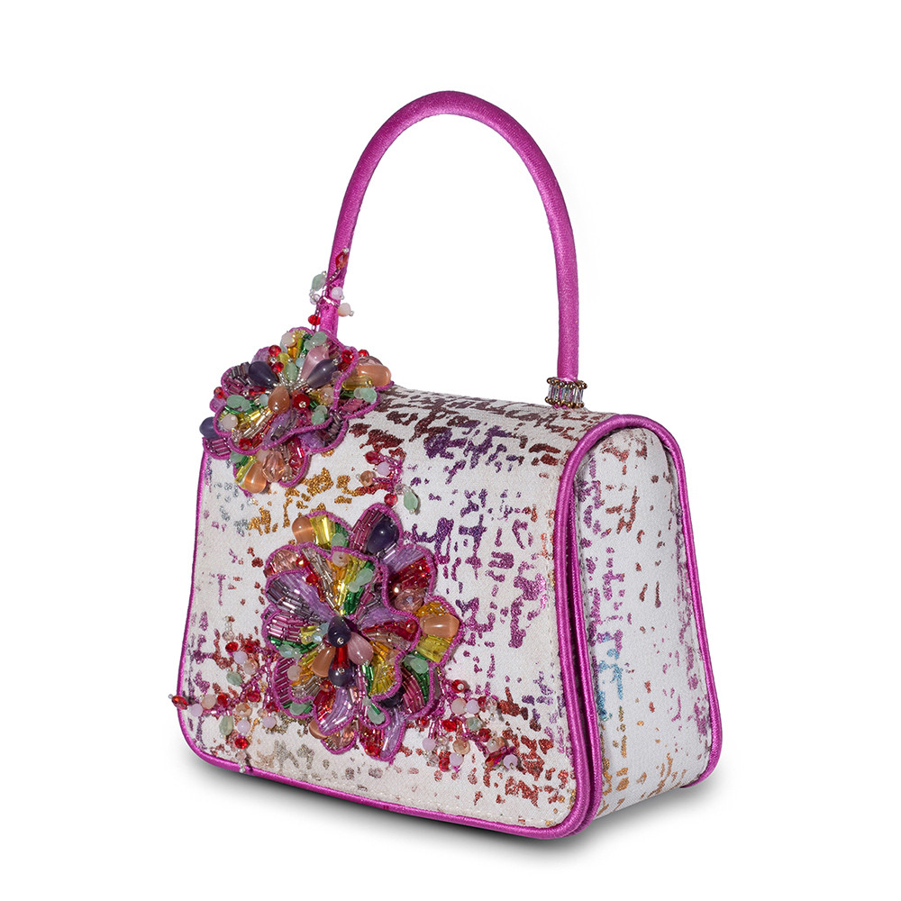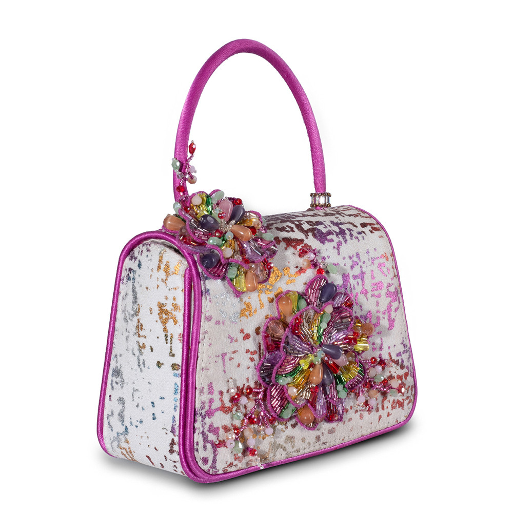 Inspired by a tropical garden with a retro-futuristic touch, the Fiona Mini Trapezium bag in white is adorned with delicate beaded flowers handcrafted with precision cut Japanese beads, rhinestones, and semi-precious stones in multicolor hues. Its compact, structured design adds a playful yet modern edge, with a delicate baguette ring top handle and crossbody chain for versatile styling. Lined with soft suedette, it’s perfect for pairing with both western and fusion occasion wear. Designed to fit makeup, currency, cards and keys, and includes an inside slip pocket for easy organization.