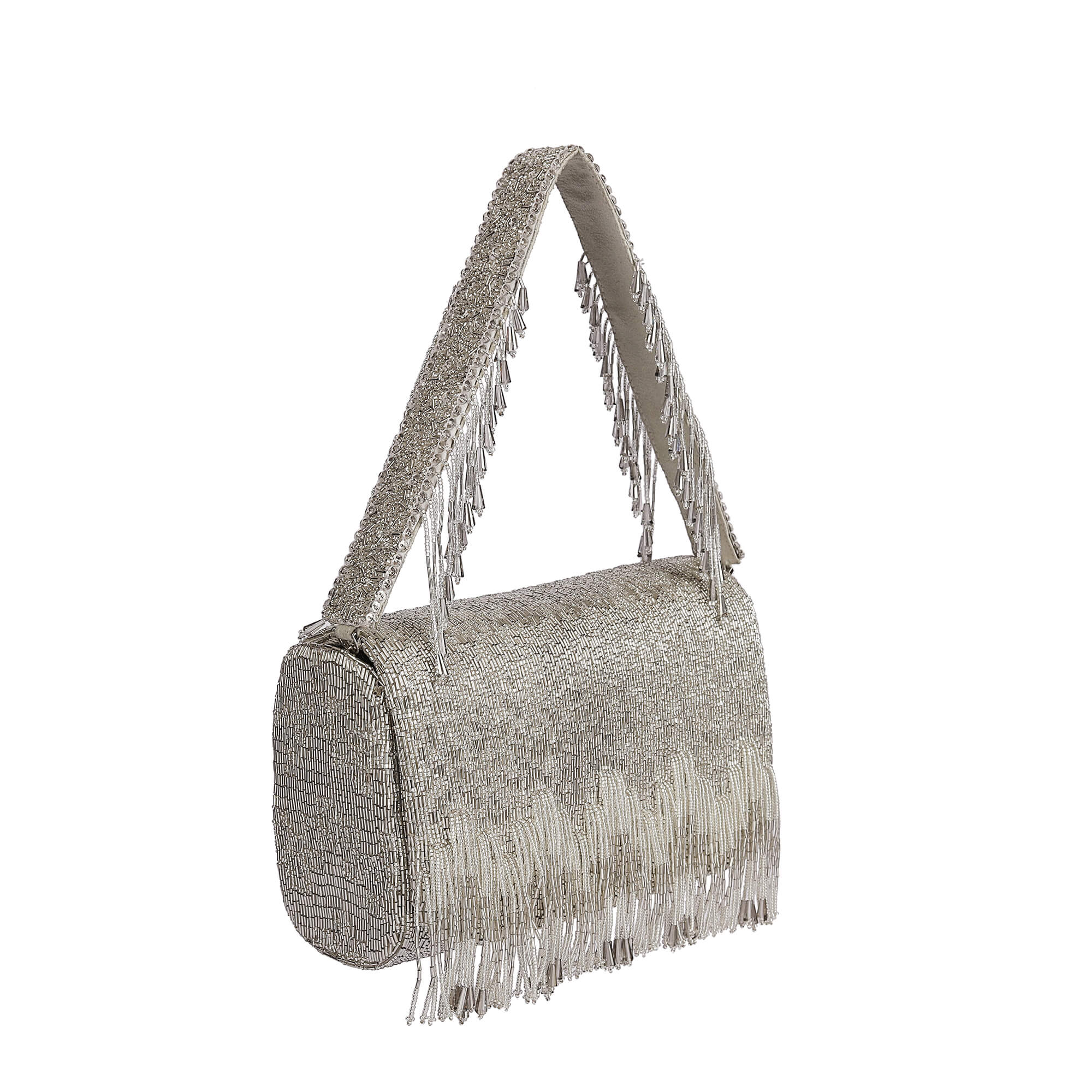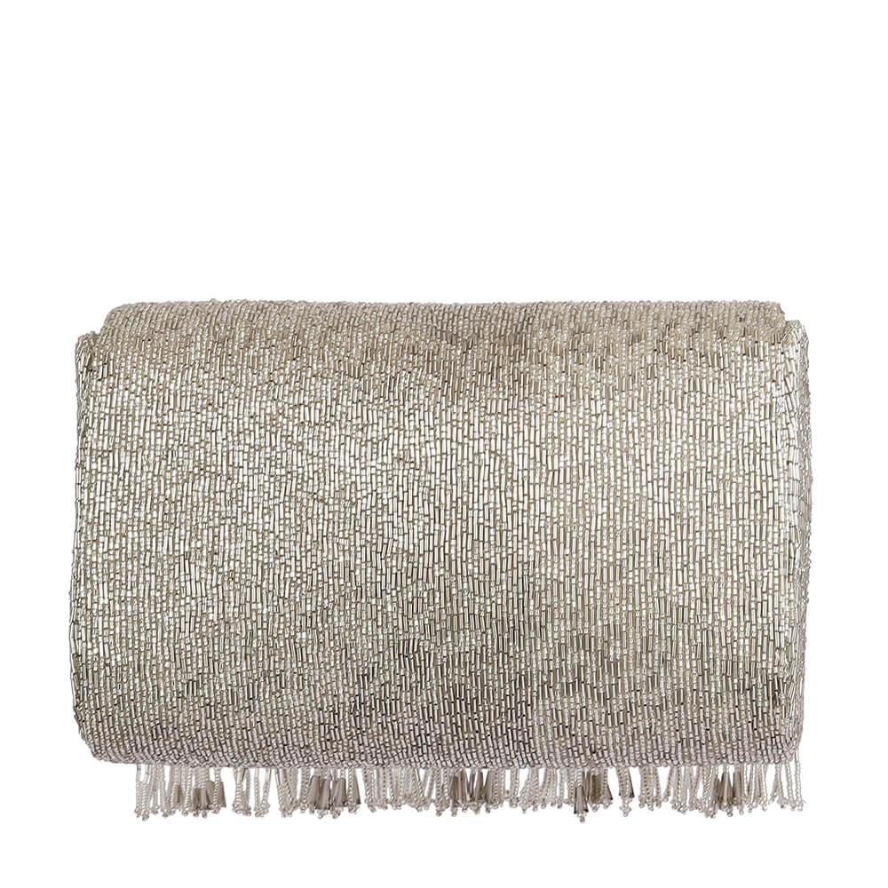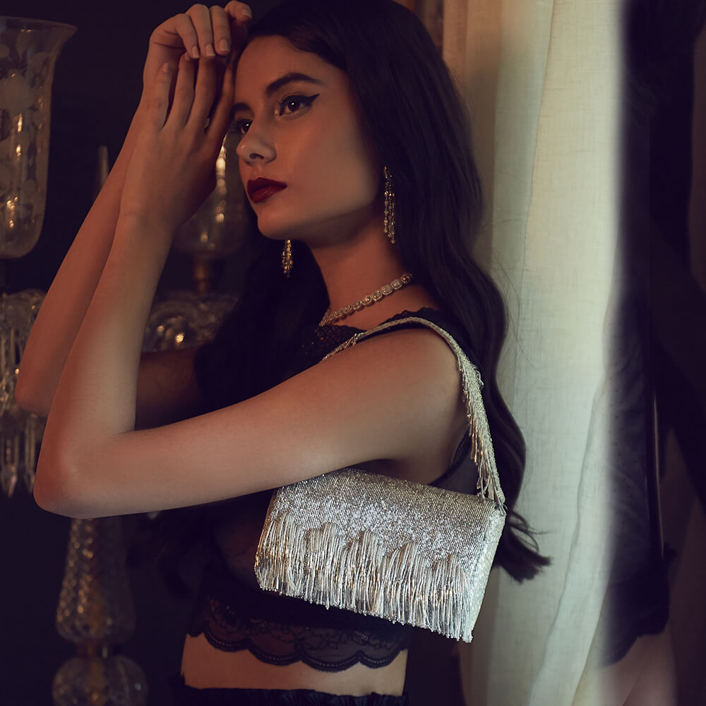 This ritzy flapover clutch is decadently hand embroidered with lustrous tinted crystals & Japanese micro beads. Aztec tassels adorn the fluid mettalic embellishment of the front side whereas a subtle geometric Pattern dresses the reverse side.As the festive season heralds party dressing , the sparkling metallic embellishment of this style is sure to amplify the opulence of any ensemble.