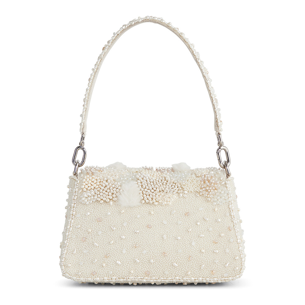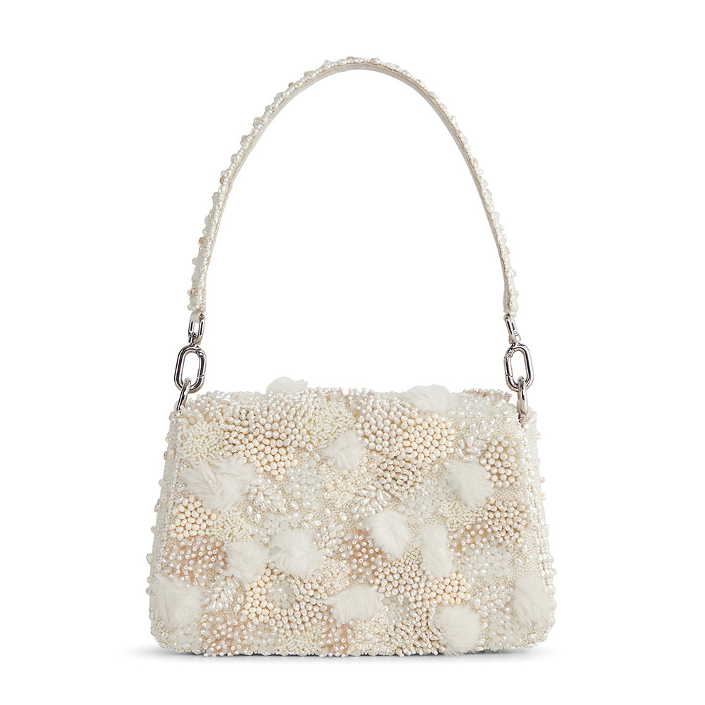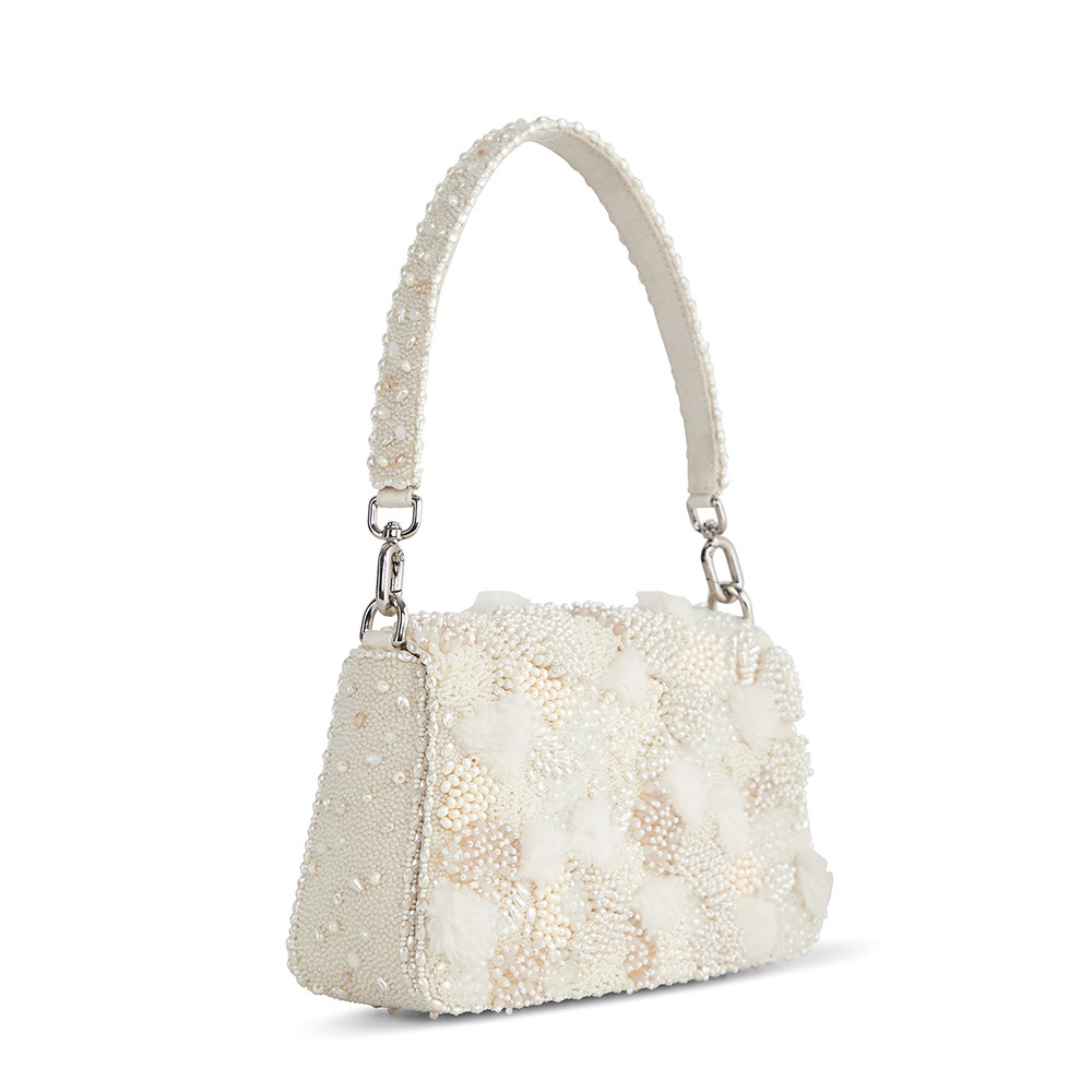 The Furoma Medium Trapezium bag draws inspiration from snow-covered landscapes, with ivory fabric adorned with snowy pearls, crystals, and precision cut Japanese beads. Its structured shape adds a modern edge, while the detachable embellished top handle and a crossbody chain offer versatile styling. Finished with a pearlesque sheen and faux fur accents, this winter accessory holds makeup, currency, cards, keys and a smartphone, and includes an inside slip pocket for easy organization.