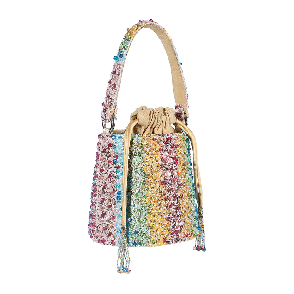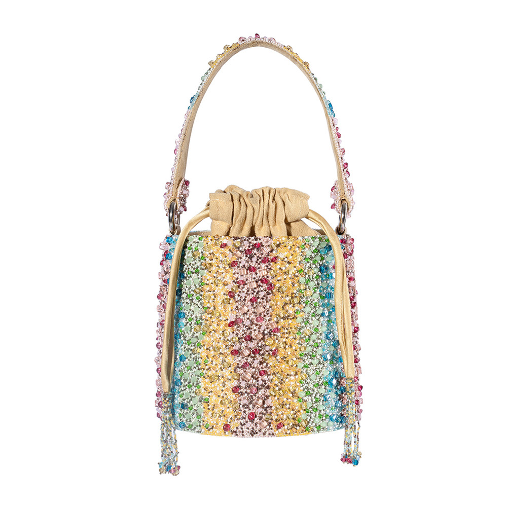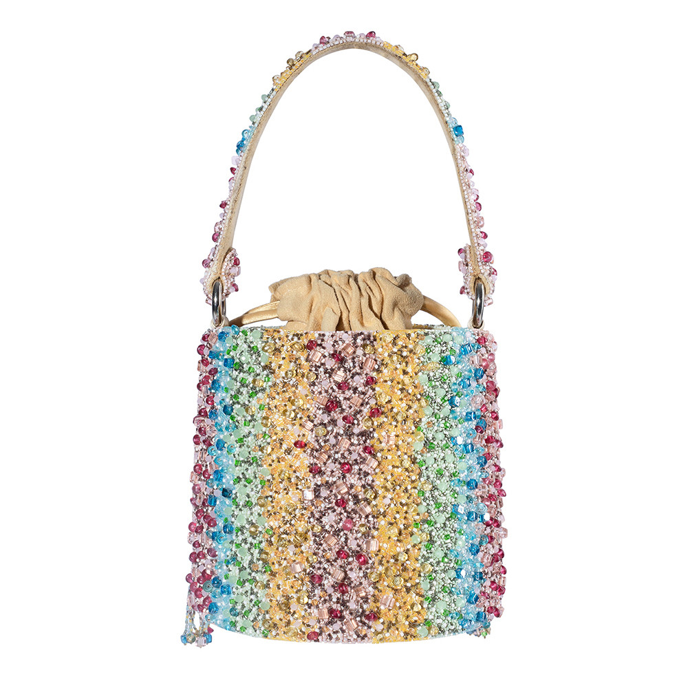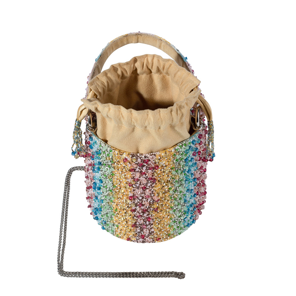 The Gia Cylindrical Basket bag showcases a dynamic play of colors inspired by vibrant painterly patterns. Featuring hand embellished precision-cut Japanese microbeads in metallic, translucent, and colorful shades, it’s accented with clustered crystals for a striking visual effect. This unique round silhouette features a drawstring closure, top handle, and a crossbody chain, perfect for carrying makeup, currency, cards, keys and a smartphone.