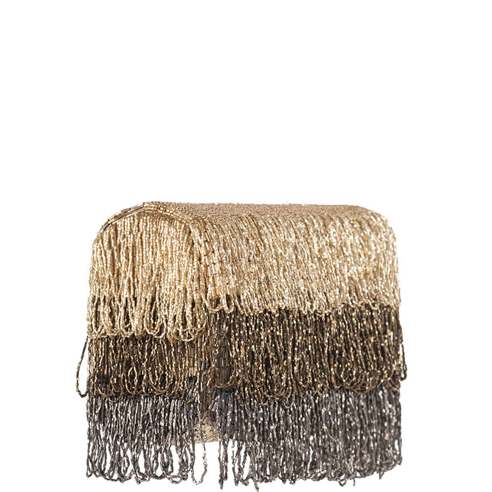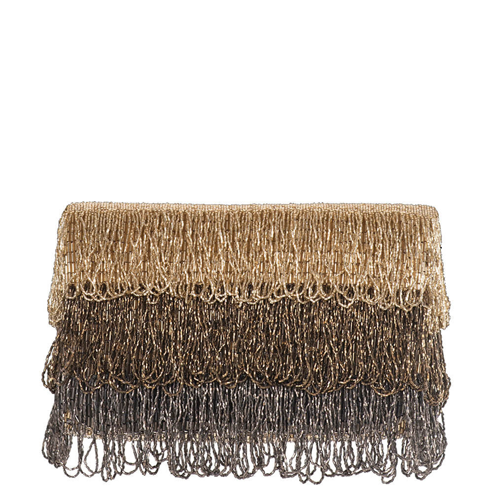 This tiered tassel flapover clutch is delicately hand embroidered with fine Japanese beads.