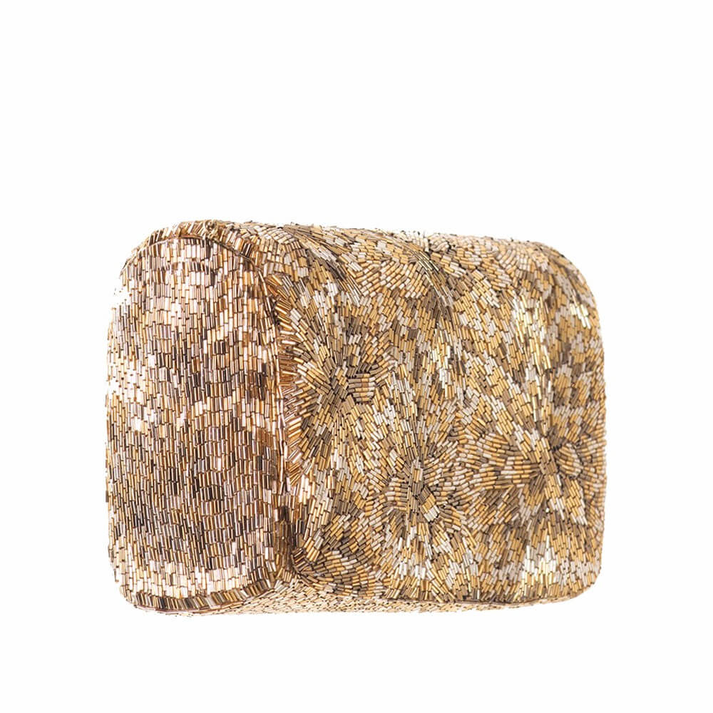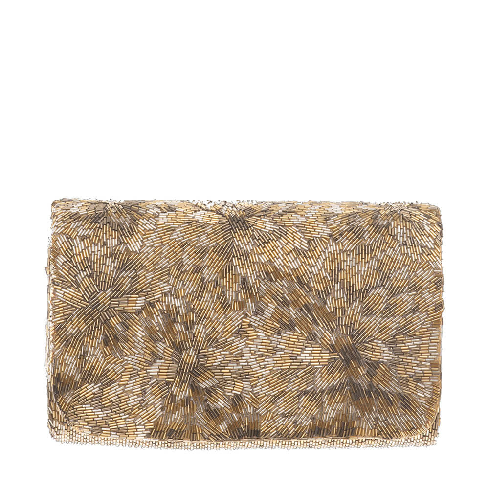 This flapover clutch is intricately hand embroidered with fine Japanese bugle beads. The design reflects a bouquet of fresh daisies with an ombre’ effect.