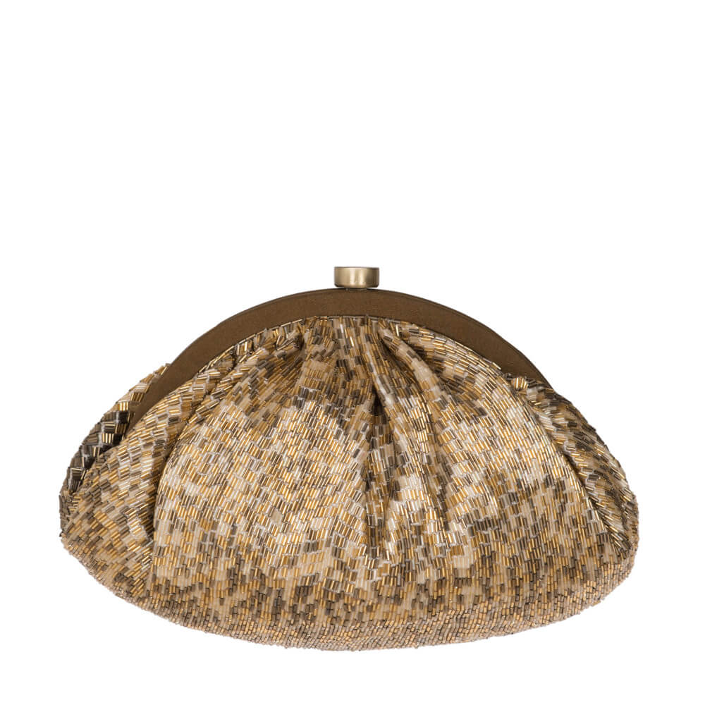 This elegant pouch is delicately hand embroidered with fine japanese bugle beads. It has a suedette lining & long detacheable chain handle . The design has an iredescent feel, transporting one to an awe inspiring world of fantasy. STYLE TIP: Carry it as a sling bag with your blue denims, classic blouses, maxis , evening ensembles as well as traditional Indianwear for a boho chic look.