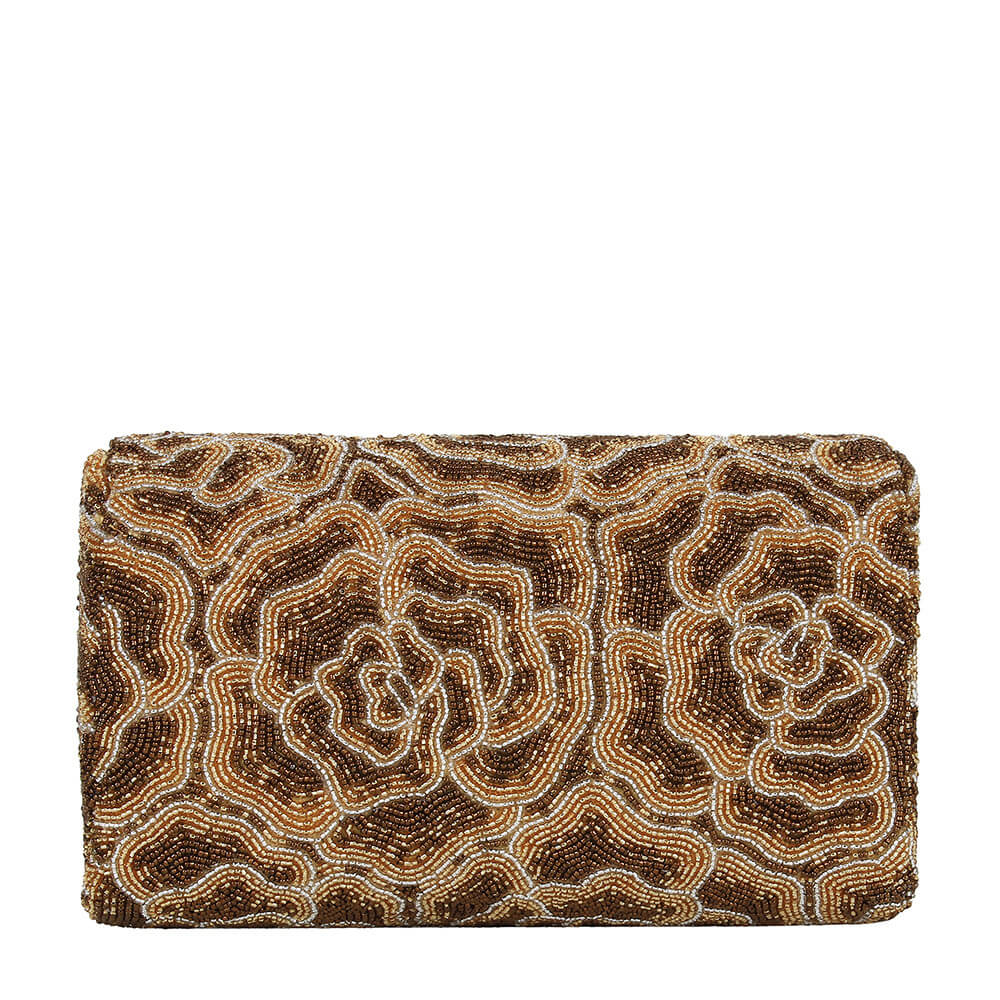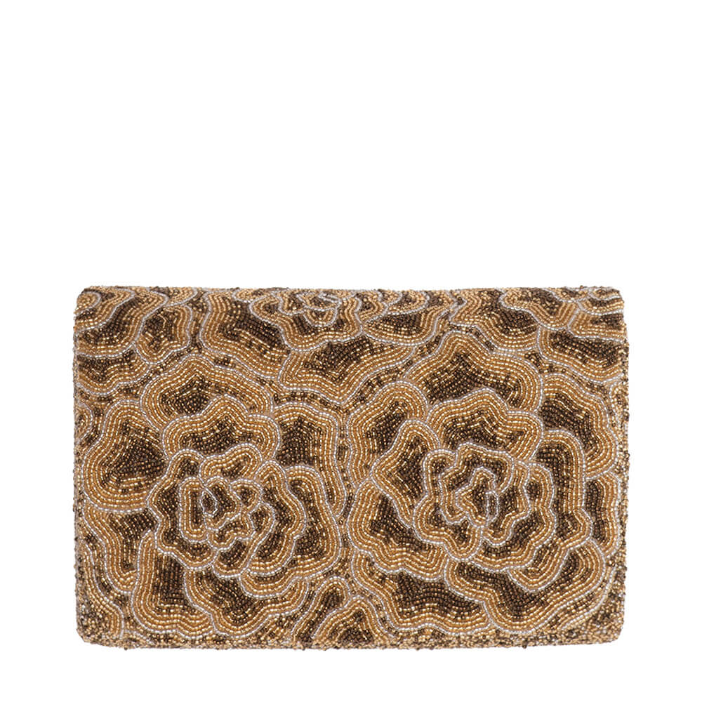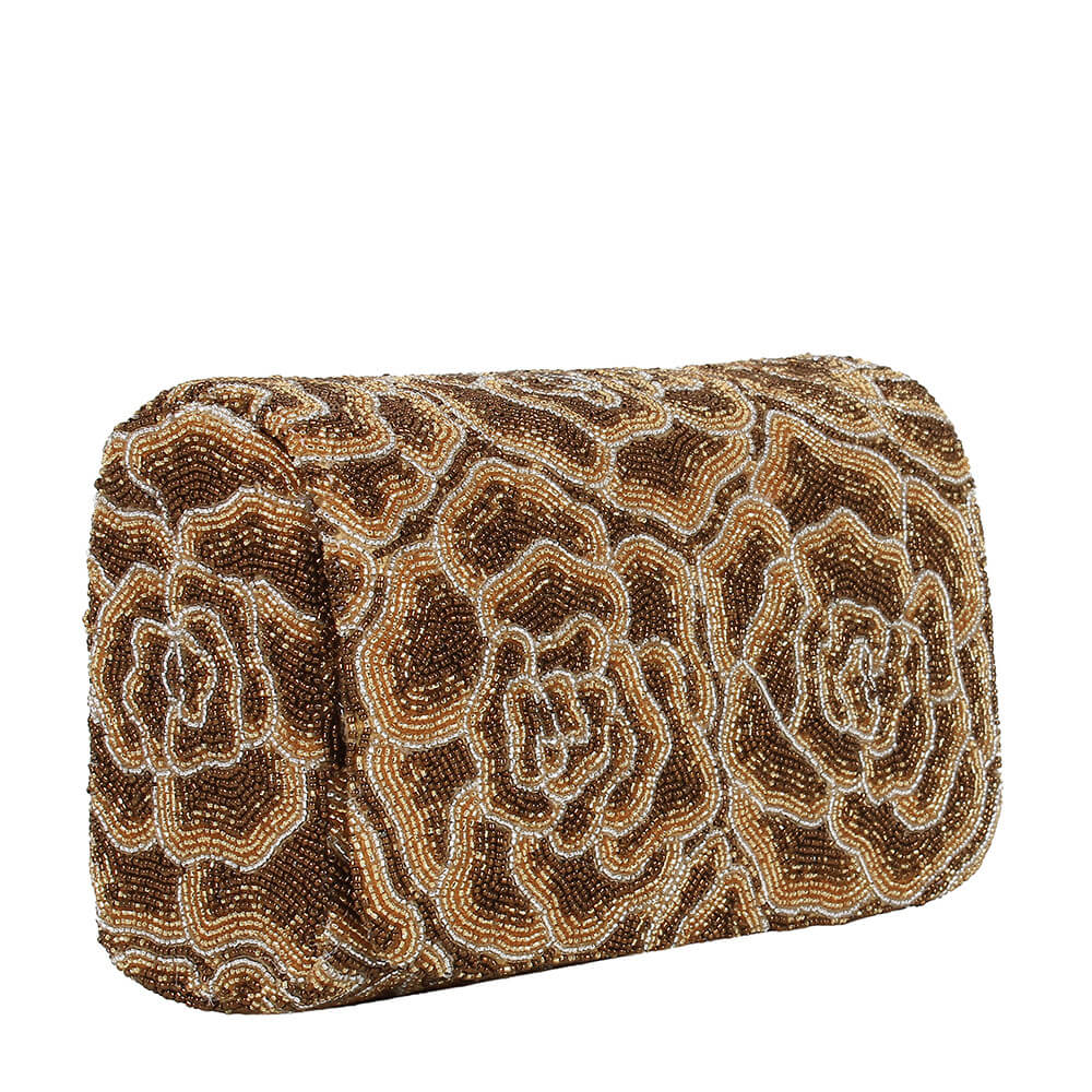 This flapover clutch is intricately hand embroidered with fine Japanese seed beads.The pattern reflects the exuberance of roses with an ombre’ effect.