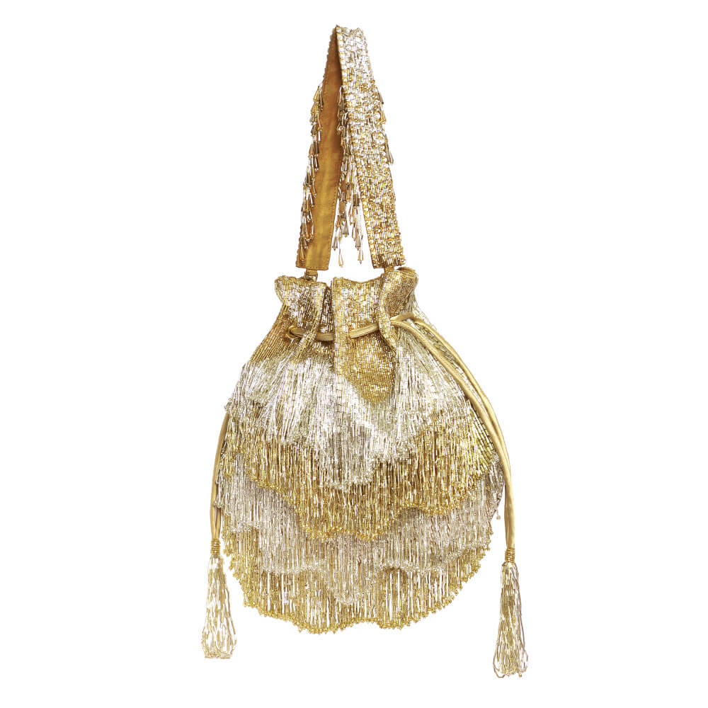 Inspired by the opulence of the golden period in French history called La Belle Epoque, this potli pouch is intricately hand embroidered with sublime Japanese bugle beads. The tiered tassels are in neutral tones adding a sense of vintage glamor to the design.