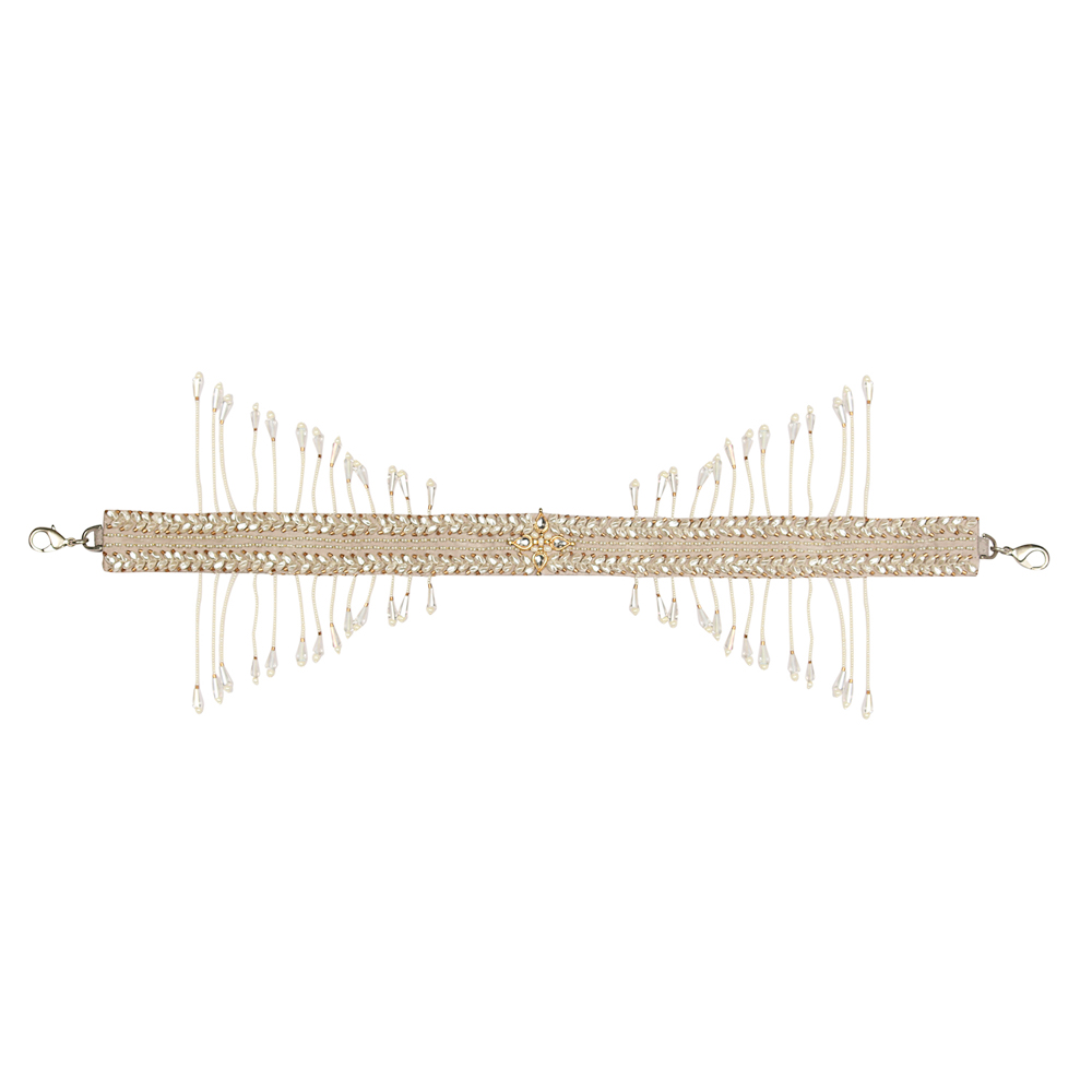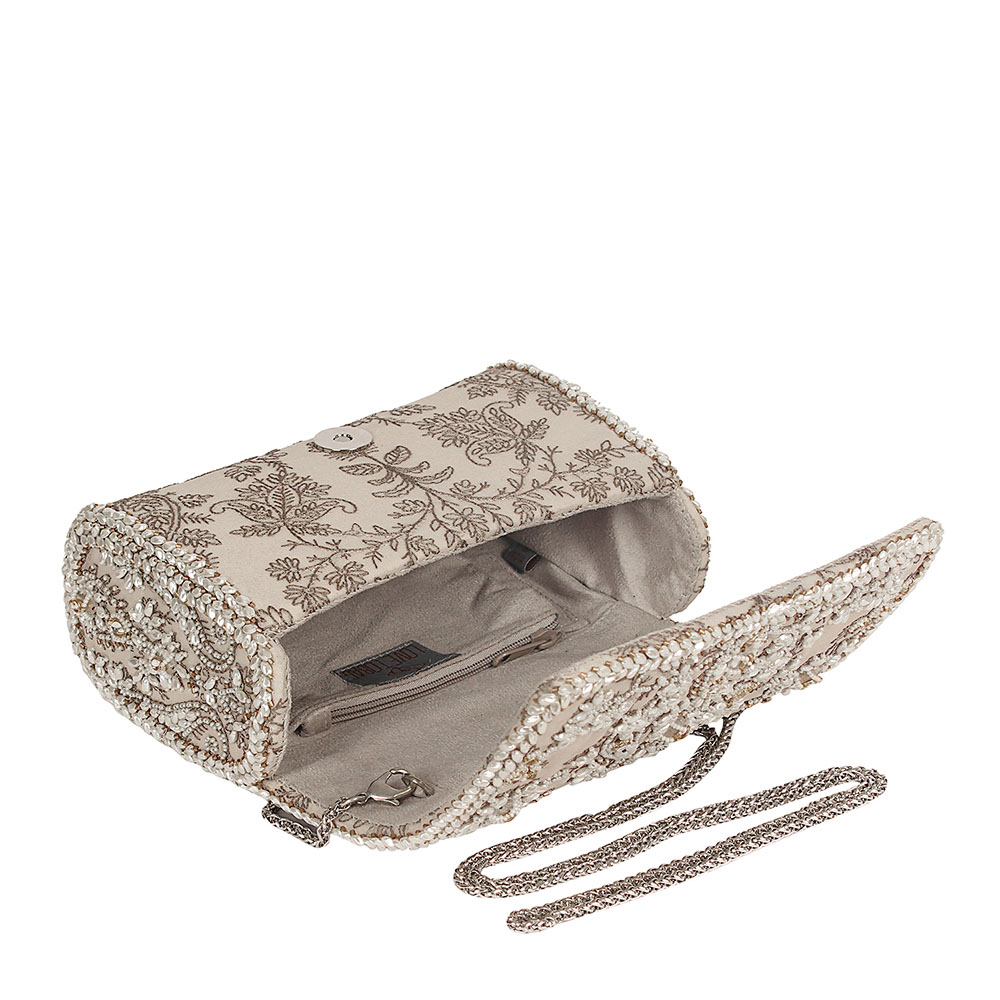 This regal flapover clutch is decadently hand embroidered with traditional kundan stones, pearls & Japanese micro beads on a bed of tonal thread shadow work. Inspired by traditional polki jewelry, it has an ethereal and contemporary look. It comes with a matching embellished handle & a long chain, to style with both modern and traditional outfits. The handle is delicately hand embroidered with lustrous Japanese micro beads, pearls, & crystals. The glittering radiance of the crystal tassels, augments the elegant demeanour of this clutch.