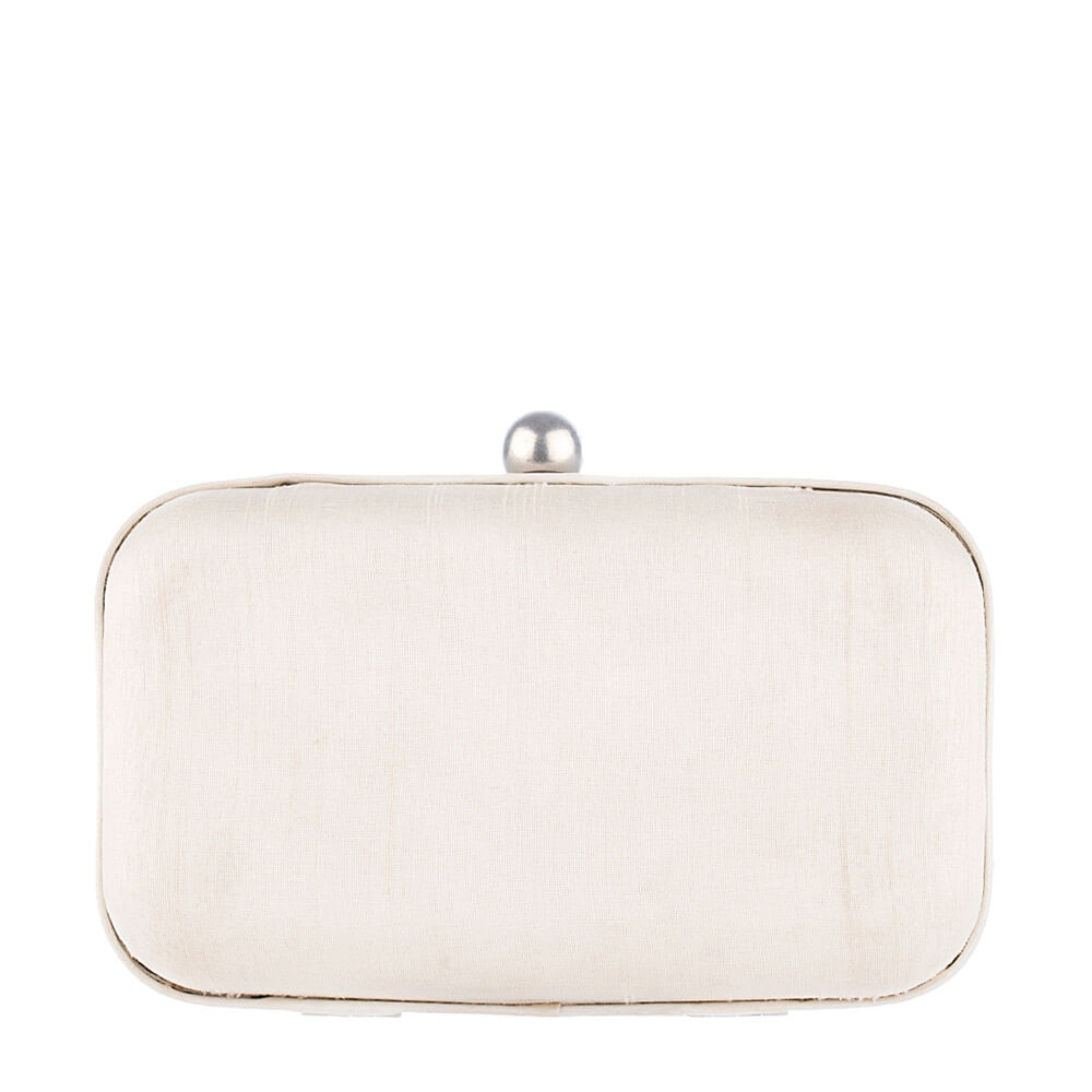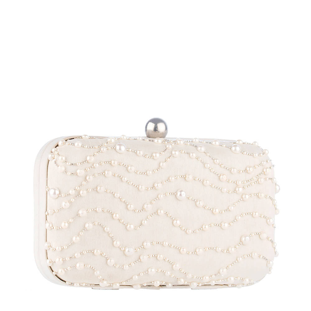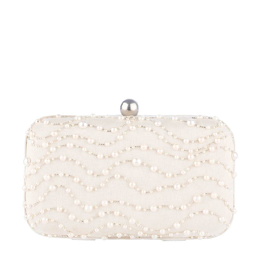 Inspired by the old world charm of of Mughal jewels, this silk box clutch is intricately hand embellished with fine cultured pearls and Japanese bugle beads.