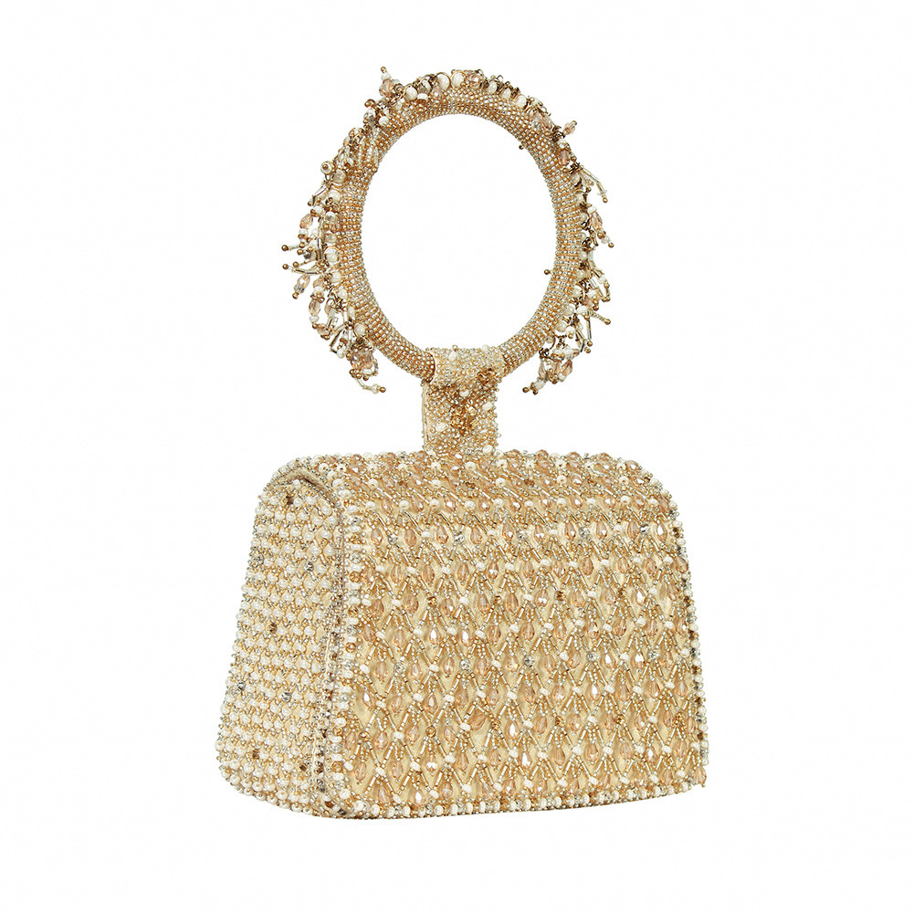 The Joel design pays homage to heritage jaali work, capturing its mysterious play of light and shadow through intricate crystal and beadwork. Faceted crystal drops enhance its graceful demeanour. Our mini trapezium bag is a compact and edgy silhouette. This flapover is designed with soft edges. The embellished attached round handle makes it a statement hand held bag. This collectible accessory fits in your valuables like makeup, keys, currency and cards.
