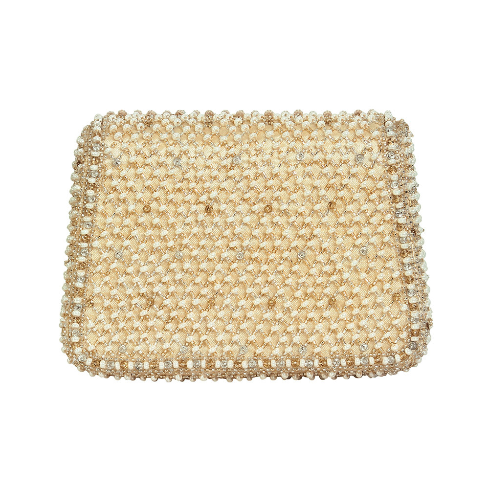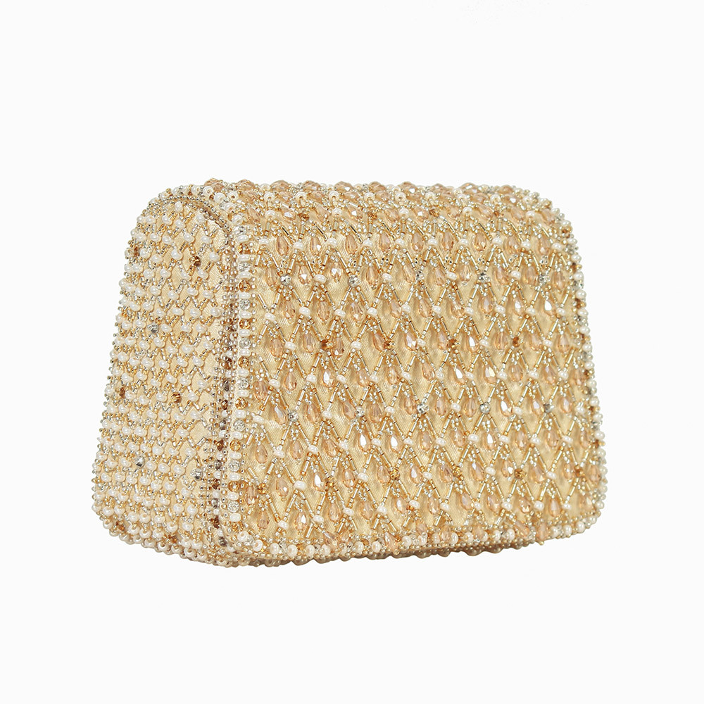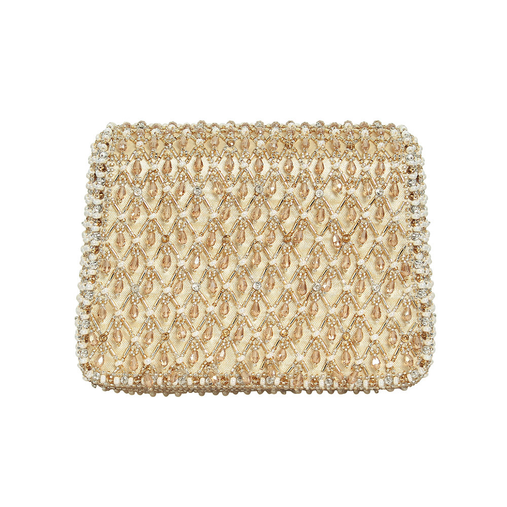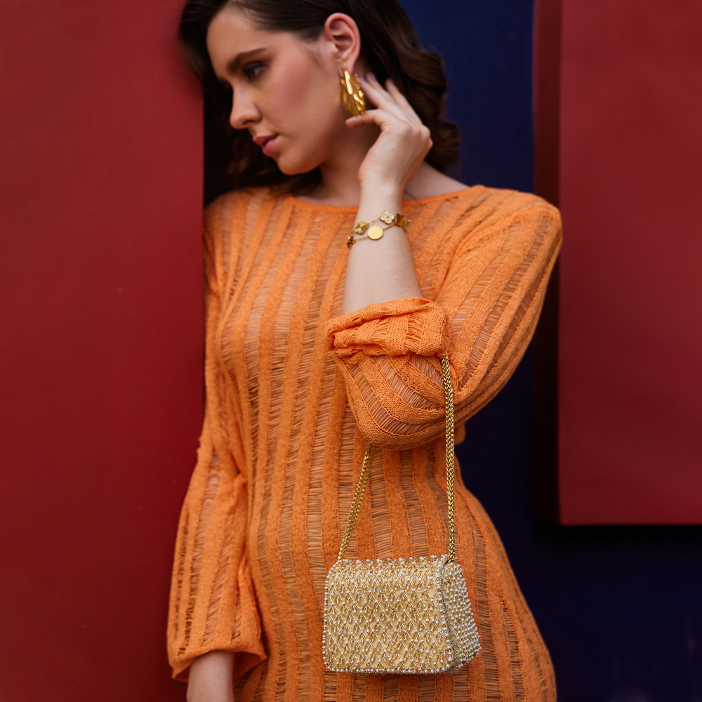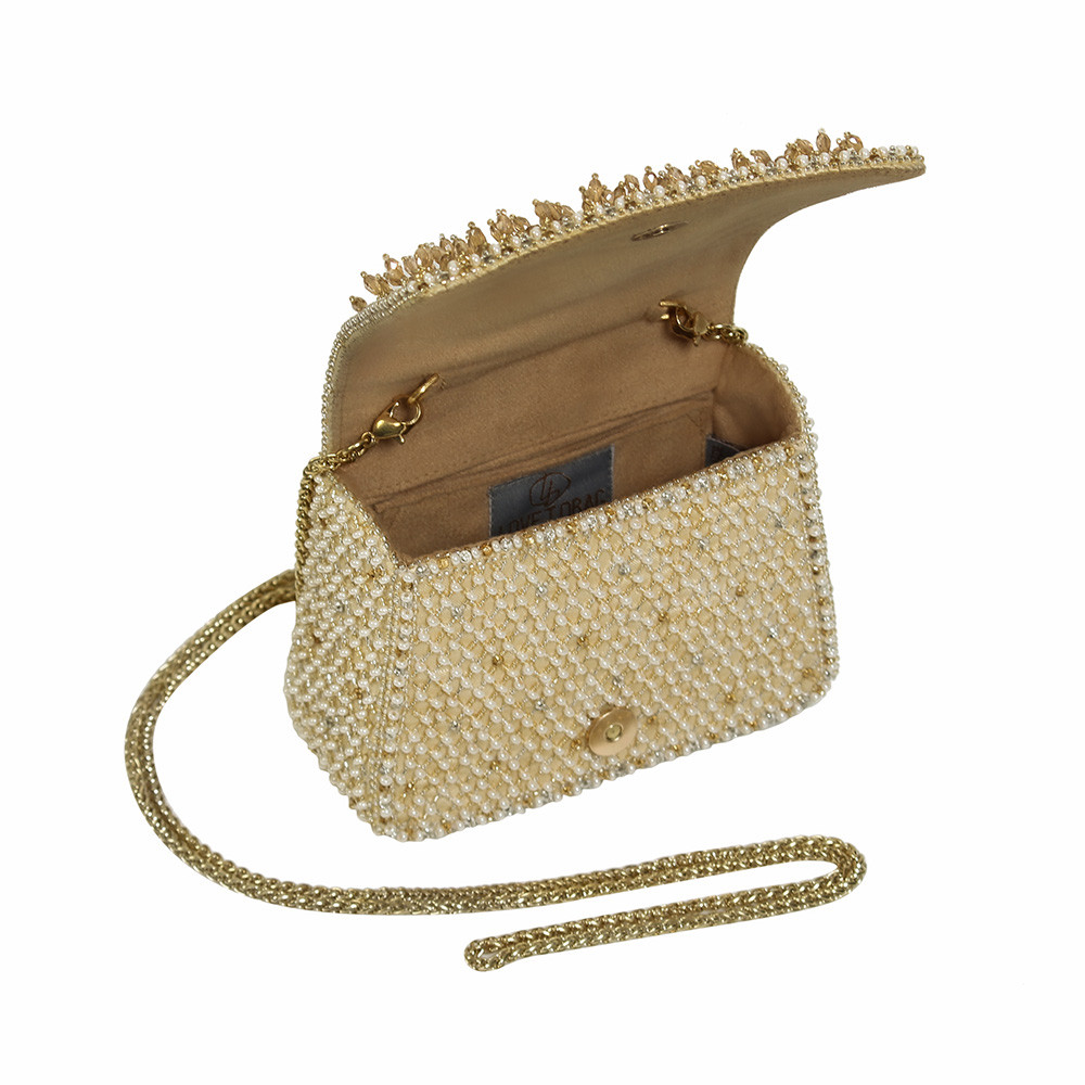 The Joel design pays homage to heritage jaali work, capturing its mysterious play of light and shadow through intricate crystal and beadwork. Faceted crystal drops enhance its graceful demeanour. Our mini trapezium bag is a compact and edgy silhouette. This flapover is designed with soft edges. It comes with a detachable sling chain. This collectible statement accessory fits in your valuables like makeup, keys, currency and cards.