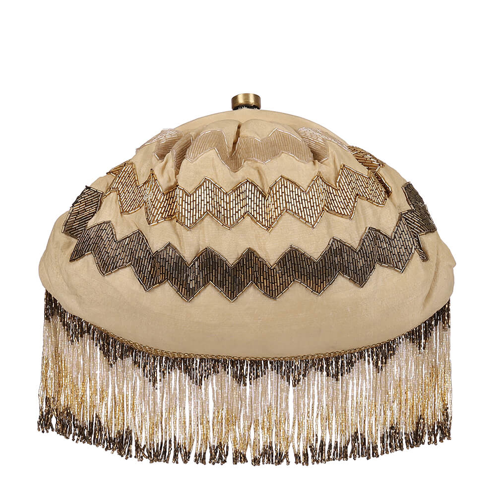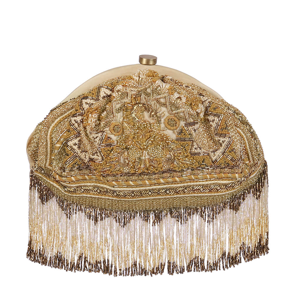 This couture soft pouch is opulently hand embroidered with luminous Japanese micro beads , glass crystals, bullion & silk floss threads. Inspired by the time honoured Palampore chintz & oriental silk carpets from the ‘Rug Belt’, this is a classic piece . This pouch can be used from both sides – Set in a sublime handbeaded mesh,an artisinal foral motif adorns the front while nonchalant chevron patterns dress the back. It has exquisite zardosi zig zag tassels.