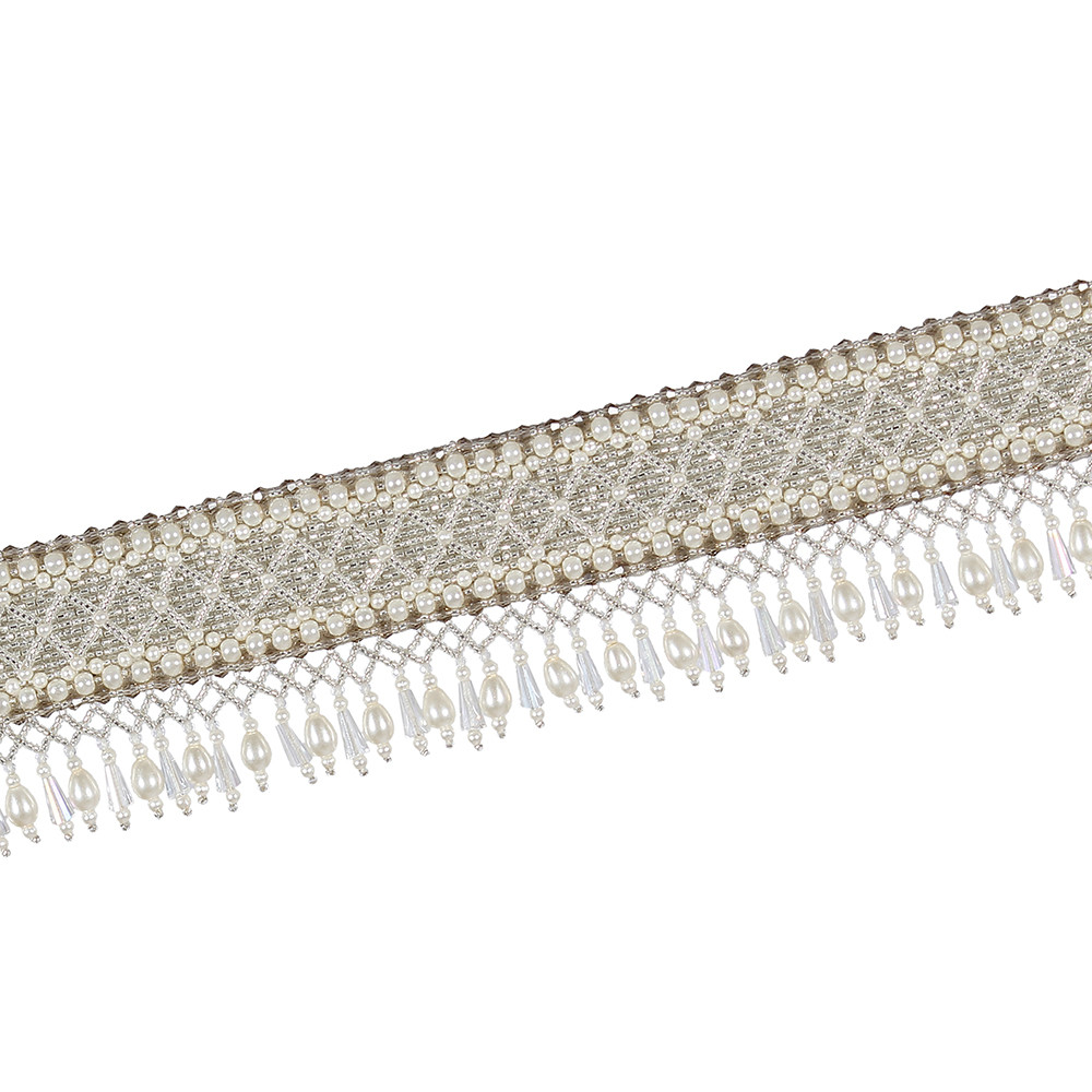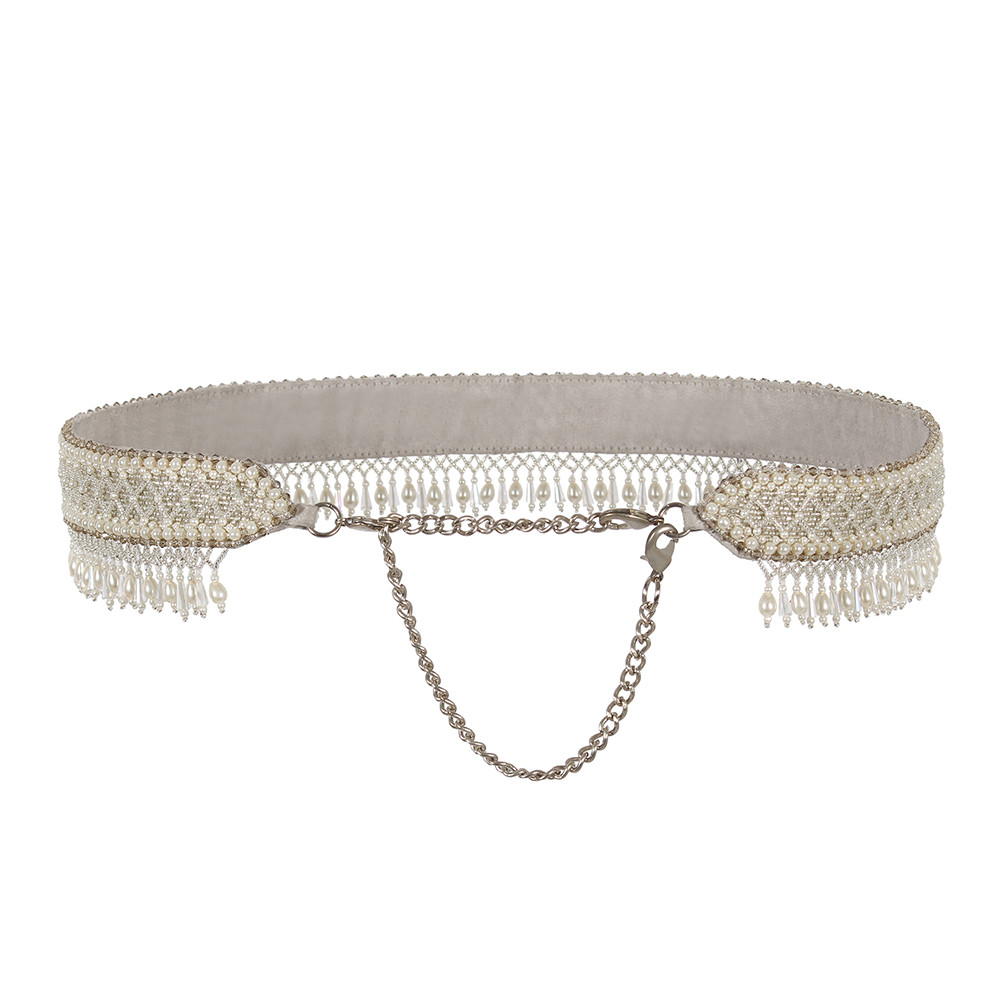 The ethereal design has been decadently hand-embroidered inspired by the serpent skin texture. The Kiah Waist Belt Lustrous Silver is an elegant statement piece of accessory. Embellished with Japanese silver and ivory beads, iridescent crystals, semi precious nuggets and stones, it has ornate tassels.
