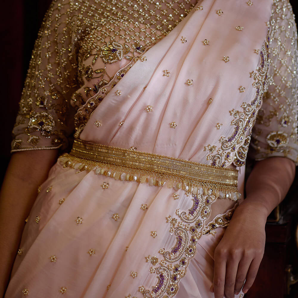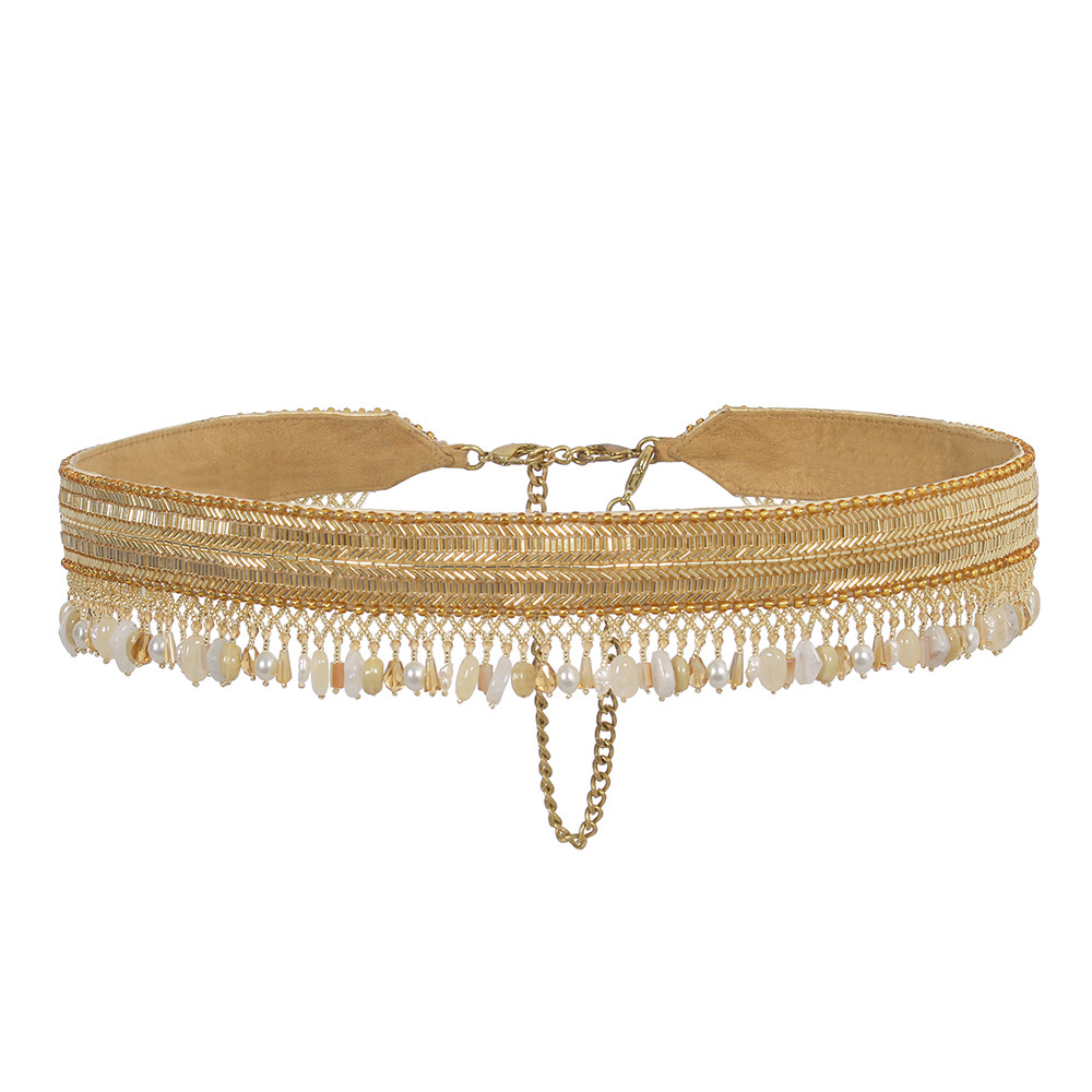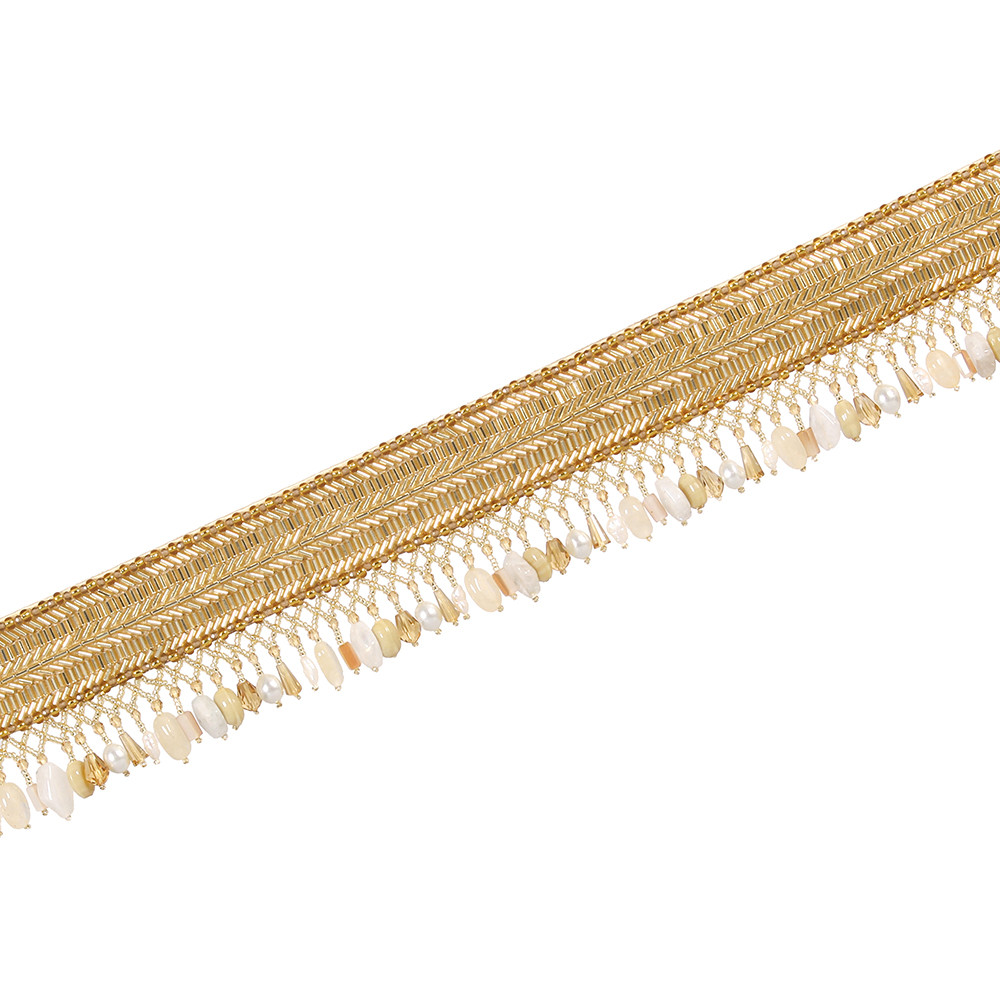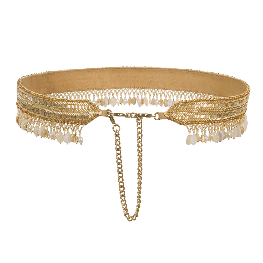 The Noori Waist belt Gold is inspired by the textures and patterns found in legacy gold jewelry. Hand embellished with muted gold japanese beads, luminous tubes, semi precious stones, iridescent crystals and pearls, the surface glimmers with opulence. Our signature tassels make it a statement accessory versatile enough to enhance any look.