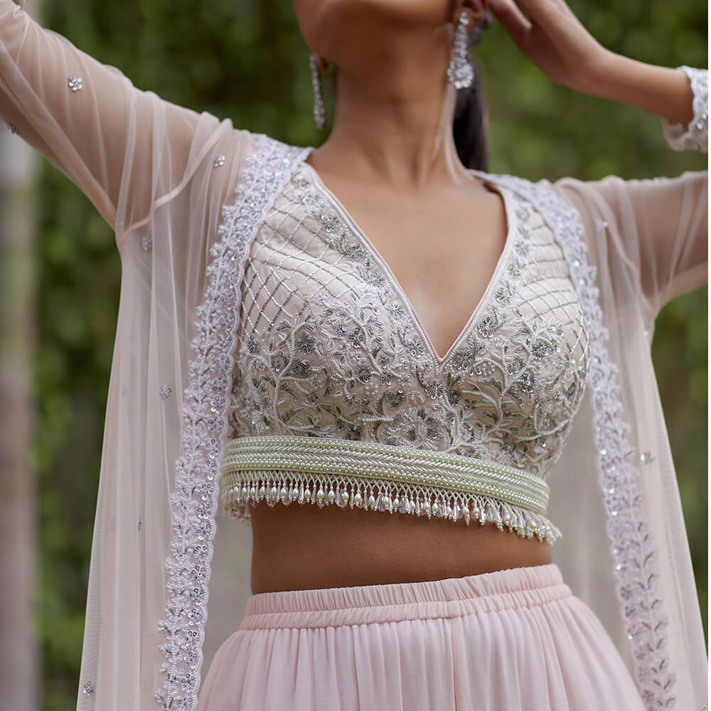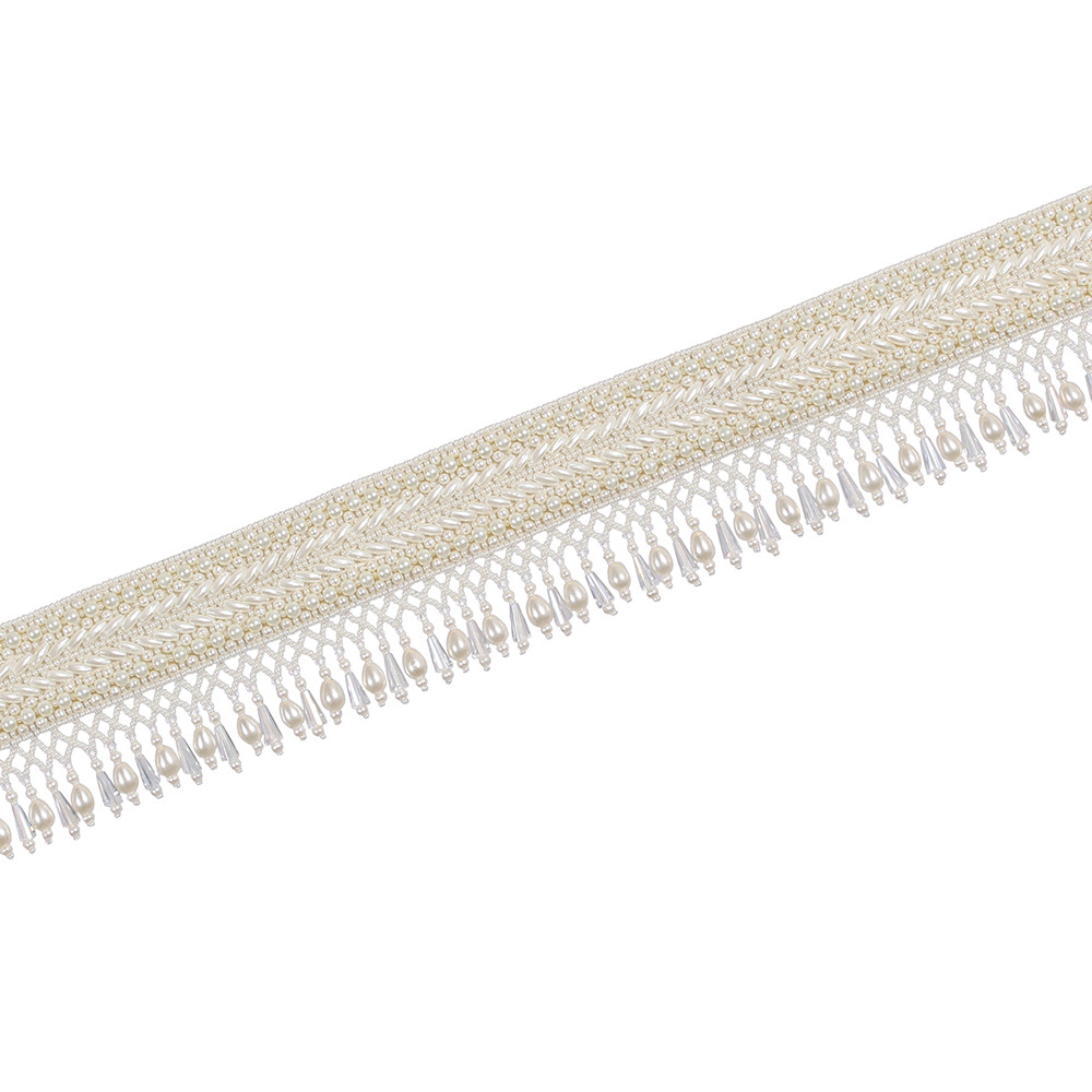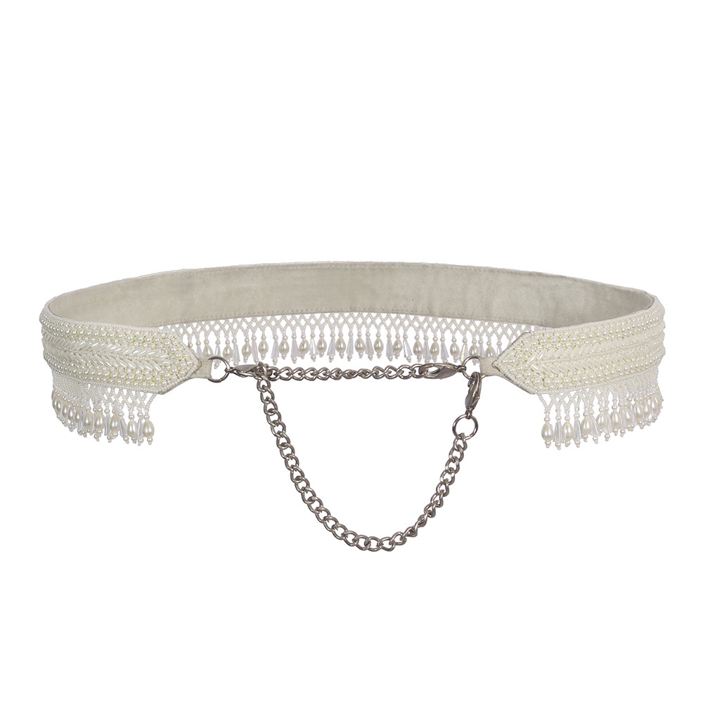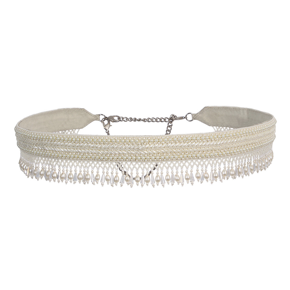 The Noori Waist belt Ivory belt is inspired by the textures and patterns found in legacy jewelry. Hand embellished with ivory pearls, Japanese beads, semi precious stones, iridescent crystals and pearls. Our signature tassels of Japanese beads, crystals, semi precious stones and pearls give it a statement look.