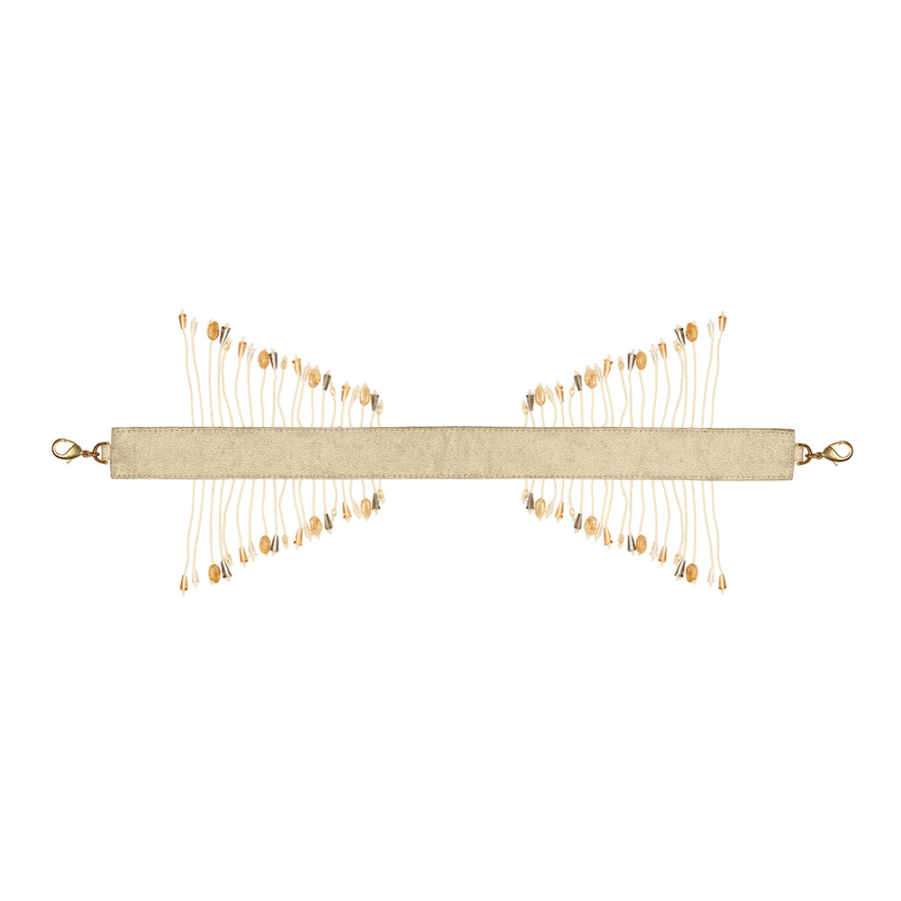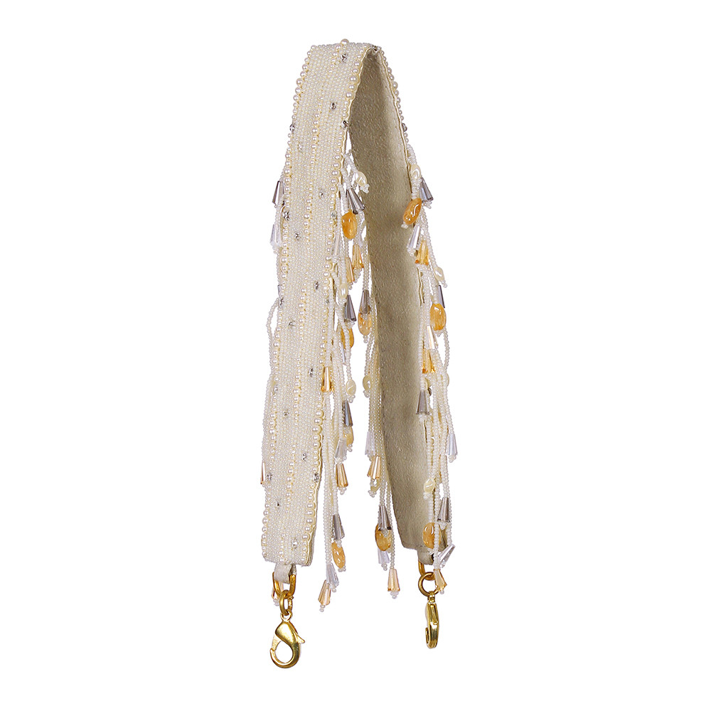 The Lovetobag embellished handle is our signature addition to make your bag an exquisite piece of art. It can be detached and interchangeably used with other Lovetobag bags. The surface is delicately hand embroidered with pristine Ivory Japanese micro beads, pearls and diamanté. The cascading tassels with luminous crystals augment the playful & youthful demeanour of any bag.