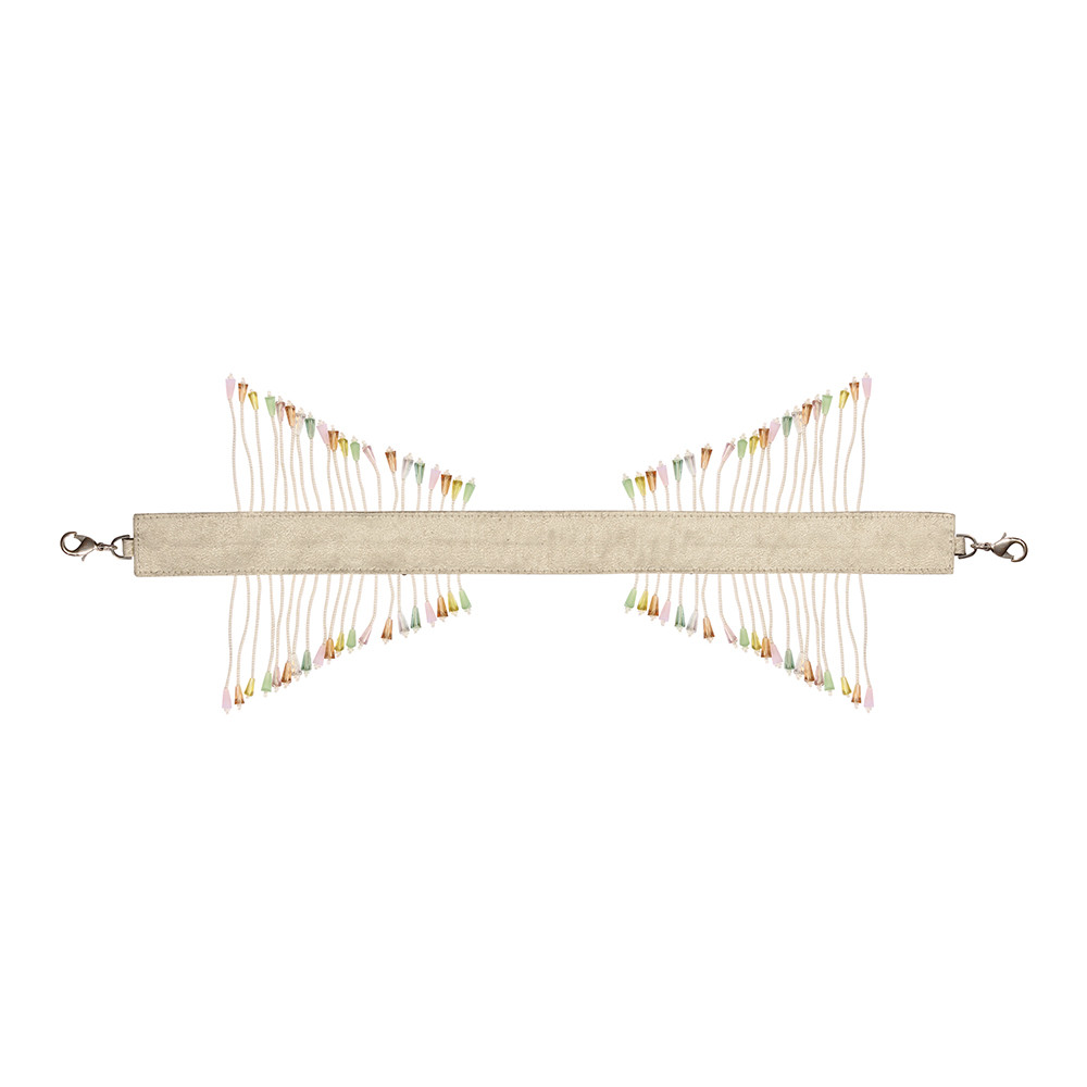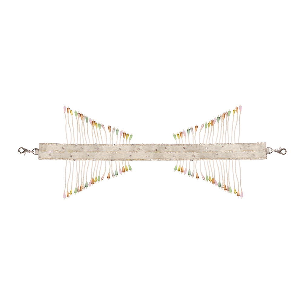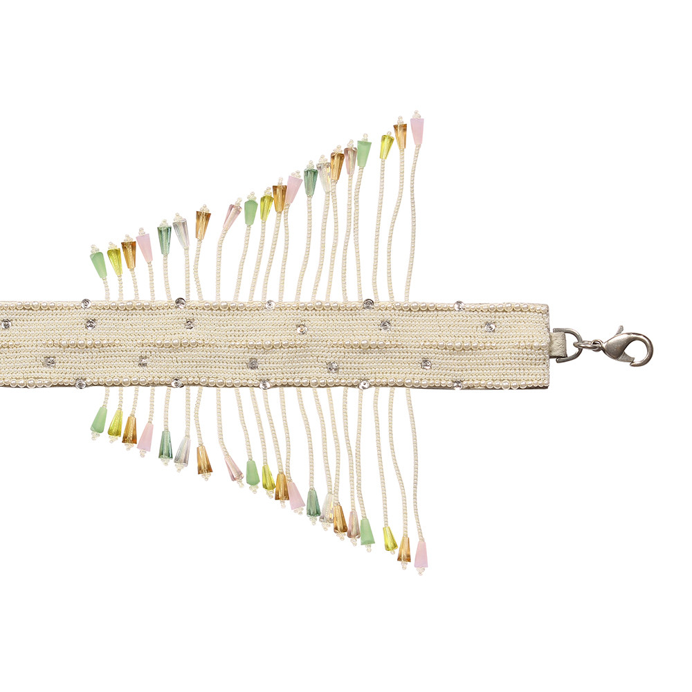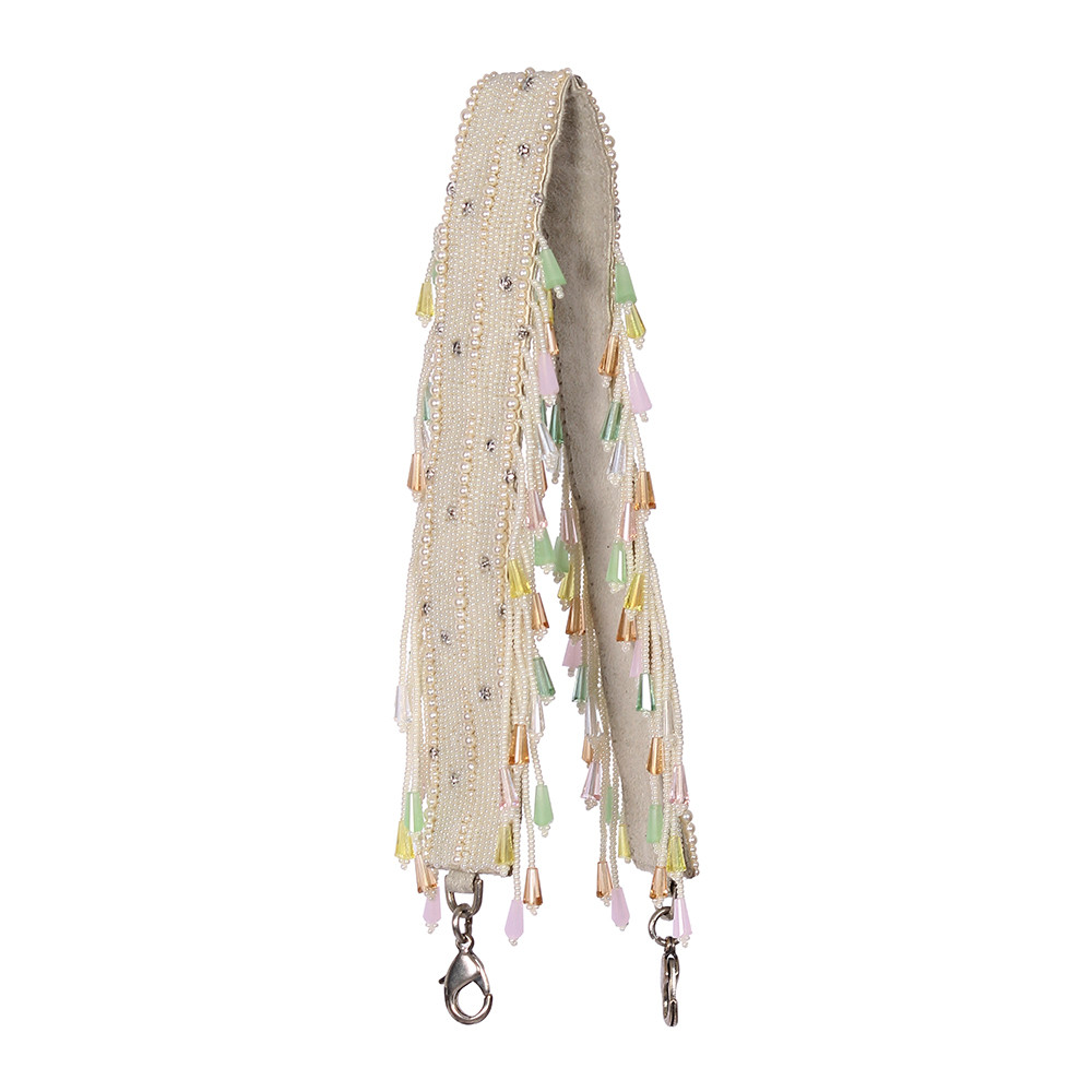The Lovetobag embellished handle is our signature addition to make your bag an exquisite collectible statement accessory. It can be detached and interchangeably used with other Lovetobag bags enhancing the opulence of the bag. The surface is delicately hand embroidered with pristine Ivory Japanese micro beads,pearls and diamanté.. The cascading tassels with pastel crystals augment the playful & youthful demeanour of any bag.