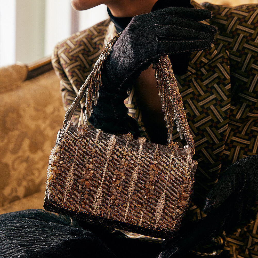 The Nora Flapover Clutch Antique features an assortment of semi-precious stones, nuggets, pearls and iridescent crystals arranged in an abstract form over a glamorous metallic ombre antique gold and gunmetal Japanese beads base. The addition of our signature embellished handle makes it a statement accessory. This collectible statement accessory fits in your valuables like a smartphone, makeup, keys, currency and cards.