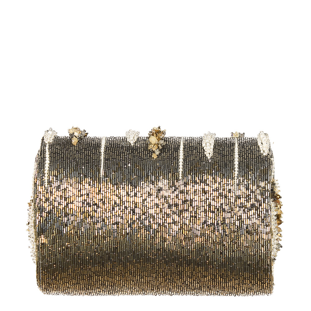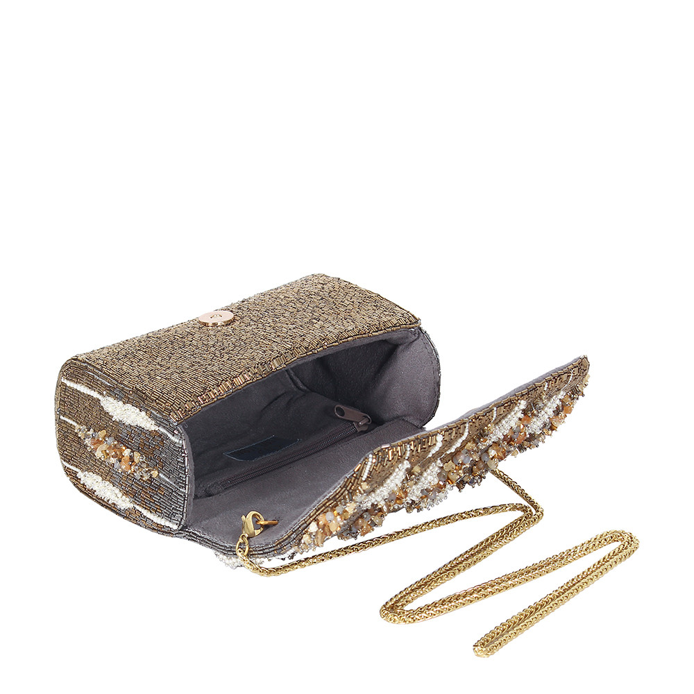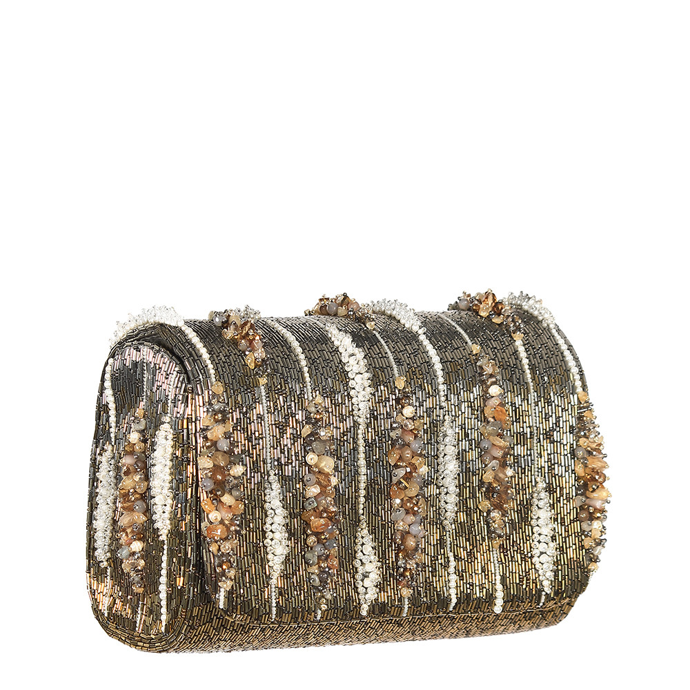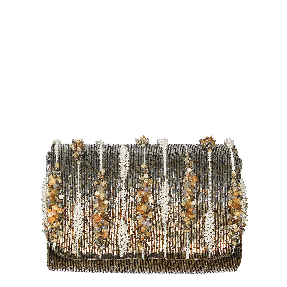 The Nora Flapover Clutch Antique features an assortment of semi-precious stones, nuggets, pearls and iridescent crystals arranged in an abstract form over a glamorous metallic ombre antique gold and gunmetal Japanese beads base. This collectible statement accessory fits in your valuables like a smartphone, makeup, keys, currency and cards.