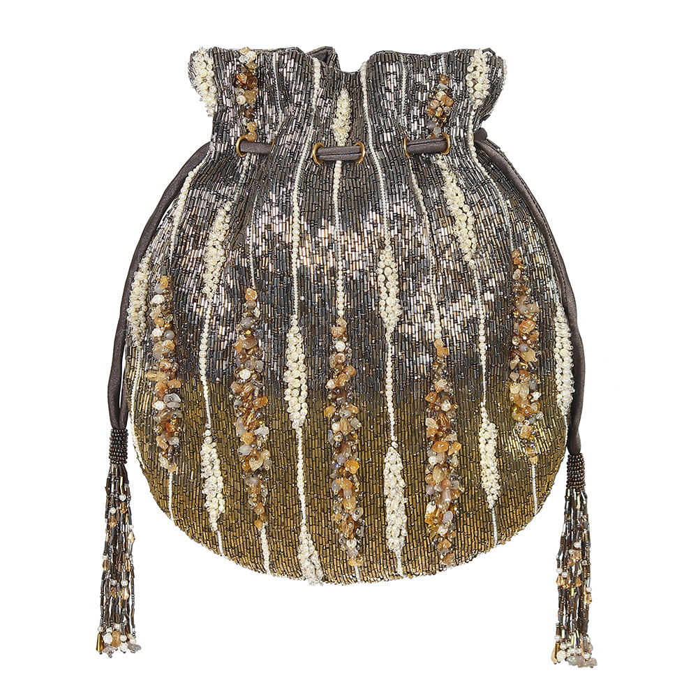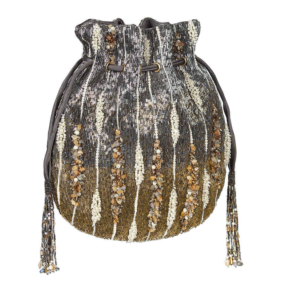 The Nora Potli Pouch Antique features an assortment of semi-precious stones, nuggets, pearls and iridescent crystals arranged in an abstract form over a glamorous metallic ombre antique gold and gunmetal Japanese beads base. This collectible statement accessory fits in your valuables like a smartphone, makeup, keys, currency and cards.