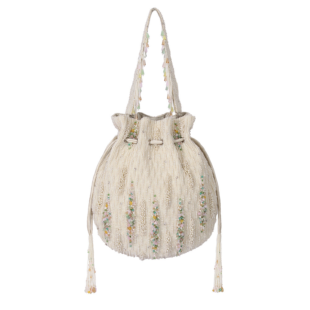 The Nora Potli Pouch Ivory Multi Hued features an assortment of quartz hued stones, nuggets, cultured pearls and iridescent crystals arranged in an abstract form over a pearlesque ivory base. The addition of our signature embellished handle makes it a statement accessory.This collectible statement accessory fits in your valuables like a smartphone, makeup, keys, currency and cards.