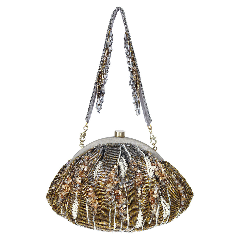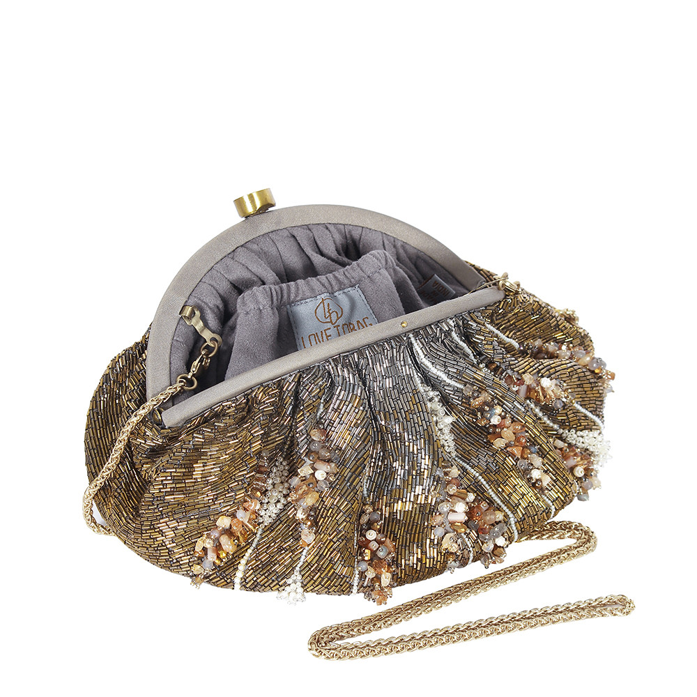 The Nora Soft Pouch Antique features an assortment of semi-precious stones, nuggets, pearls and iridescent crystals arranged in an abstract form over a glamorous metallic ombre antique gold and gunmetal Japanese beads base. The addition of our signature embellished handle makes it a statement accessory. This collectible statement accessory fits in your valuables like a smartphone, makeup, keys, currency and cards.