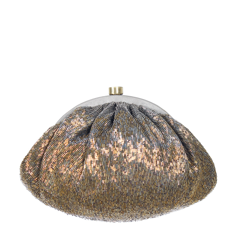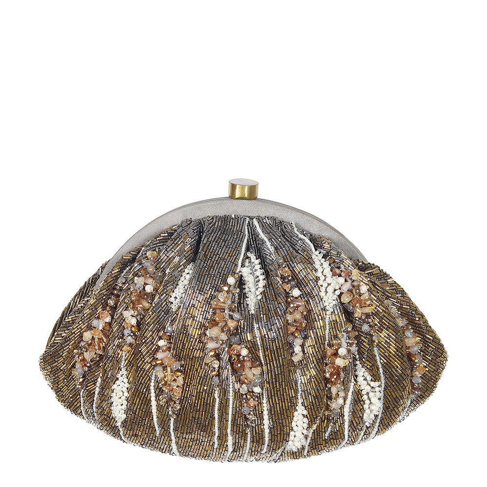 The Nora Soft Pouch Antique features an assortment of semi-precious stones, nuggets, pearls and iridescent crystals arranged in an abstract form over a glamorous metallic ombre antique gold and gunmetal Japanese beads base. This collectible statement accessory fits in your valuables like a smartphone, makeup, keys, currency and cards.
