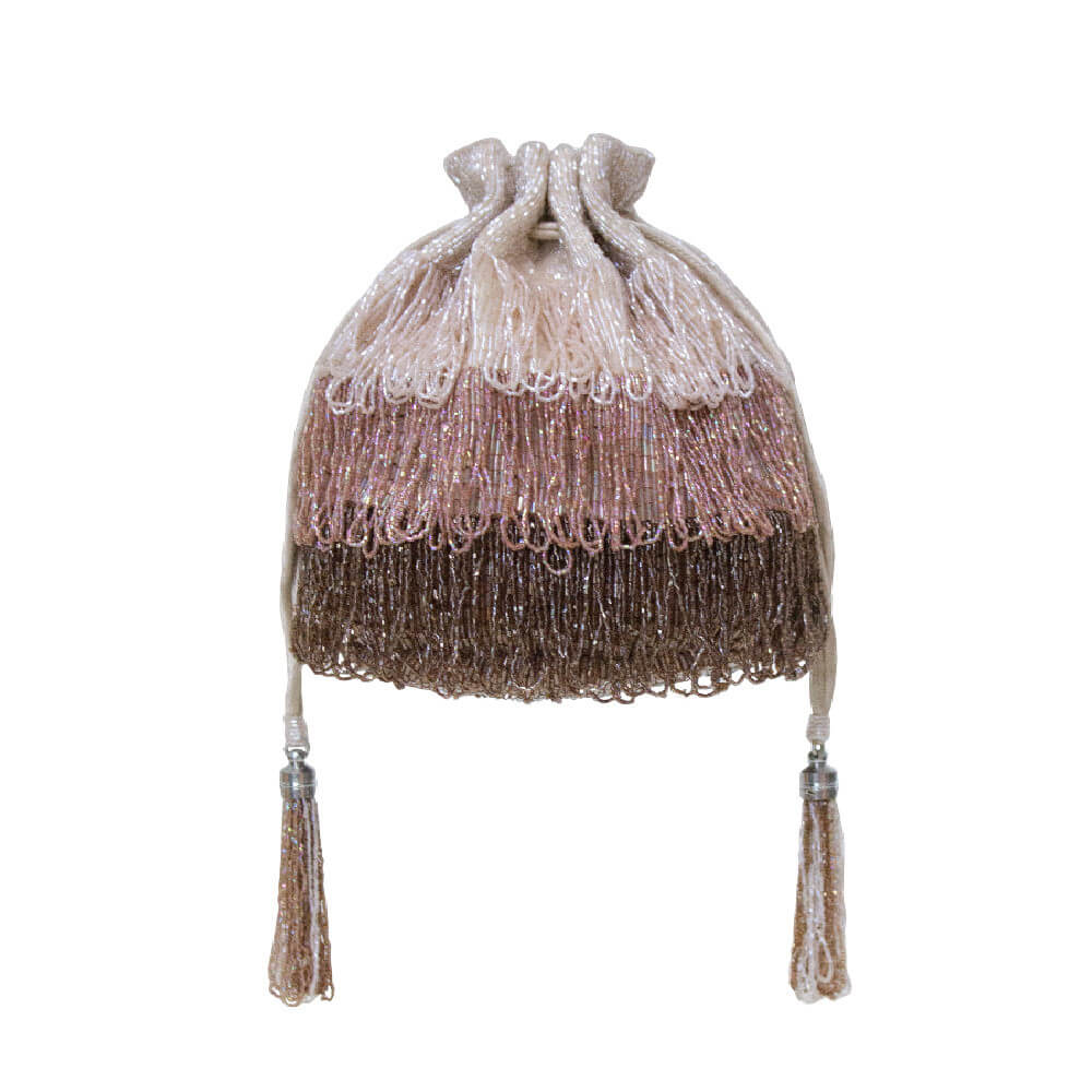 Delicate Japanese glass beads hand embroidered pouch with wristlet and chain handle.