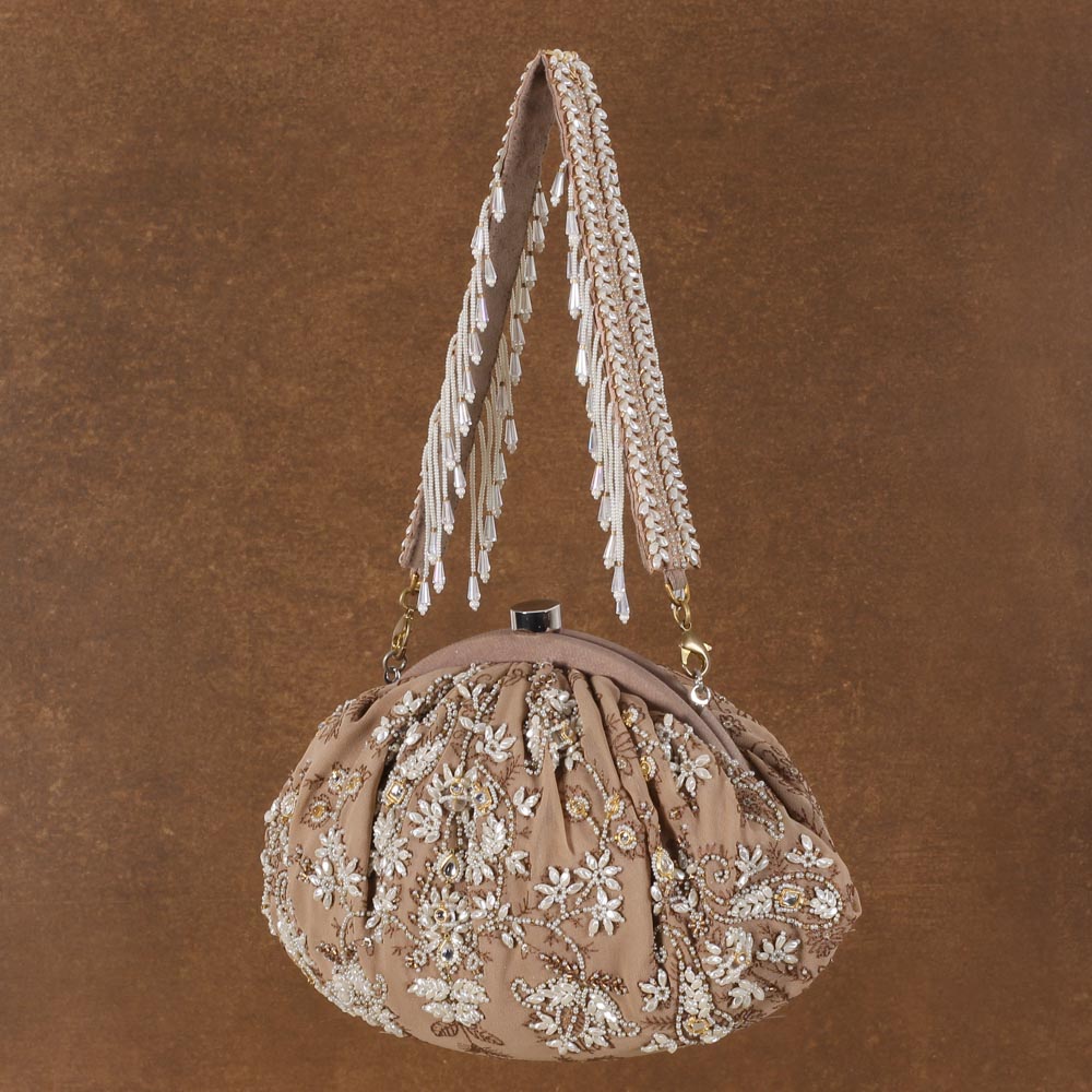 This regal pouch is decadently hand embroidered with traditional kundan stones , pearls & Japanese micro beads on a bed of tonal thread shadow work. Inspired by traditional polki jewelry, it has an ethereal and contemporary look. It comes with a matching embellished handle & a long chain, to style with both modern and traditional outfits. The handle is delicately hand embroidered with lustrous Japanese micro beads, pearls, & crystals. The glittering radiance of the crystal tassels, augments the elegant demeanour of this pouch.