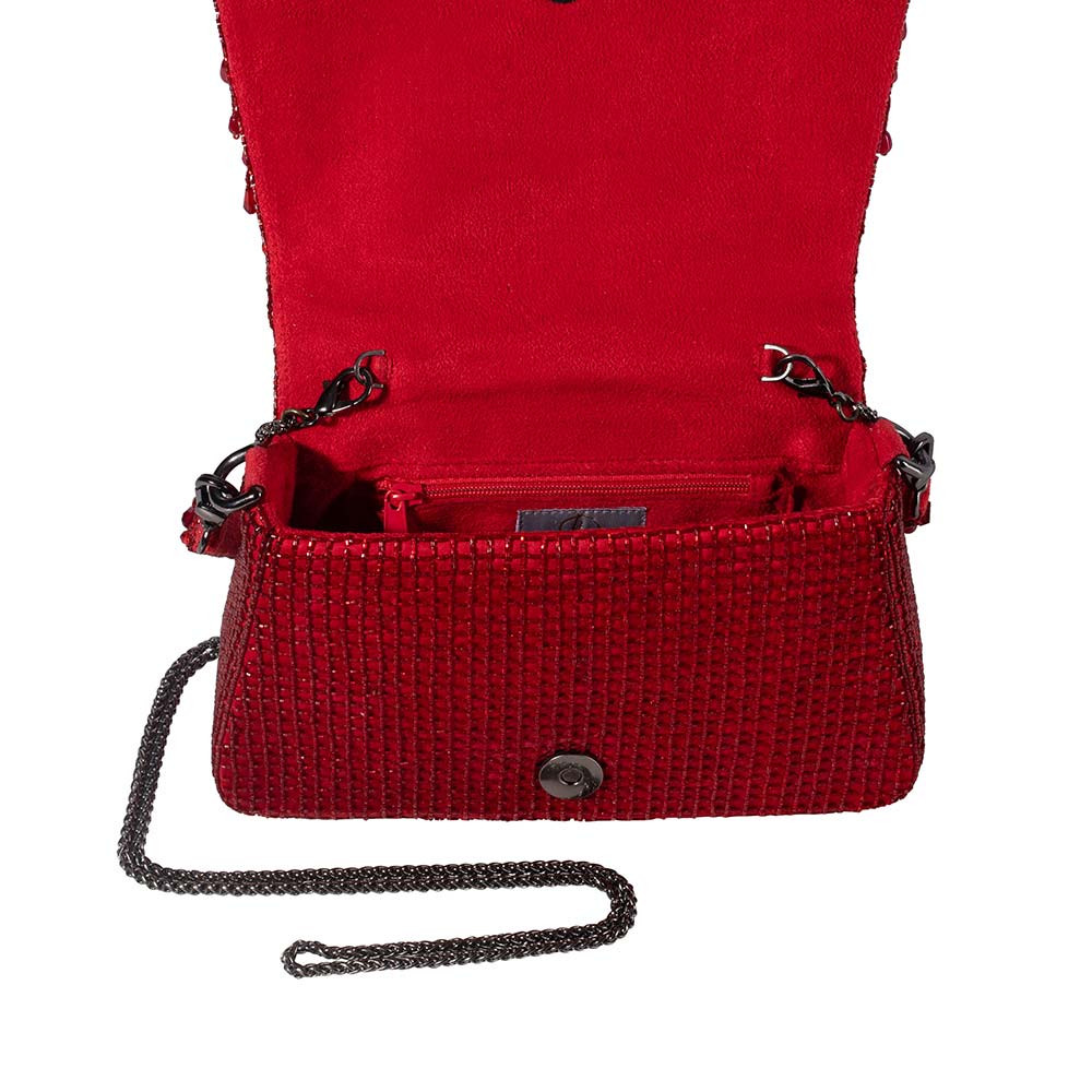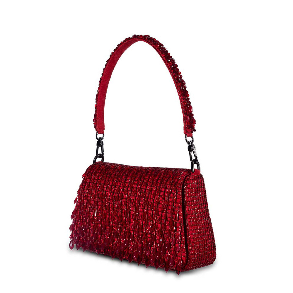The Opal Medium Trapezium in Ruby Red is hand-embroidered with semi-precious gems, precision cut Japanese microbeads, and crystals in a vibrant ombré pattern. Its structured angular shape adds a bold, modern edge, while the detachable embellished top handle and a crossbody chain provide multiple styling options. Perfect for holding makeup, currency, cards, keys and a smartphone, and includes an inside slip pocket for easy organization.