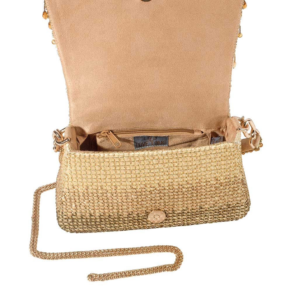 The Opal Medium Trapezium in Peerless Gold is hand-embroidered with semi-precious gems, precision cut Japanese microbeads, and crystals, forming a luxurious ombré pattern. Its structured, angular shape adds a refined edge, while the detachable embellished top handle and a crossbody chain offer versatile styling. Perfect for holding makeup, currency, cards, keys and a smartphone, and includes an inside slip pocket for easy organization.