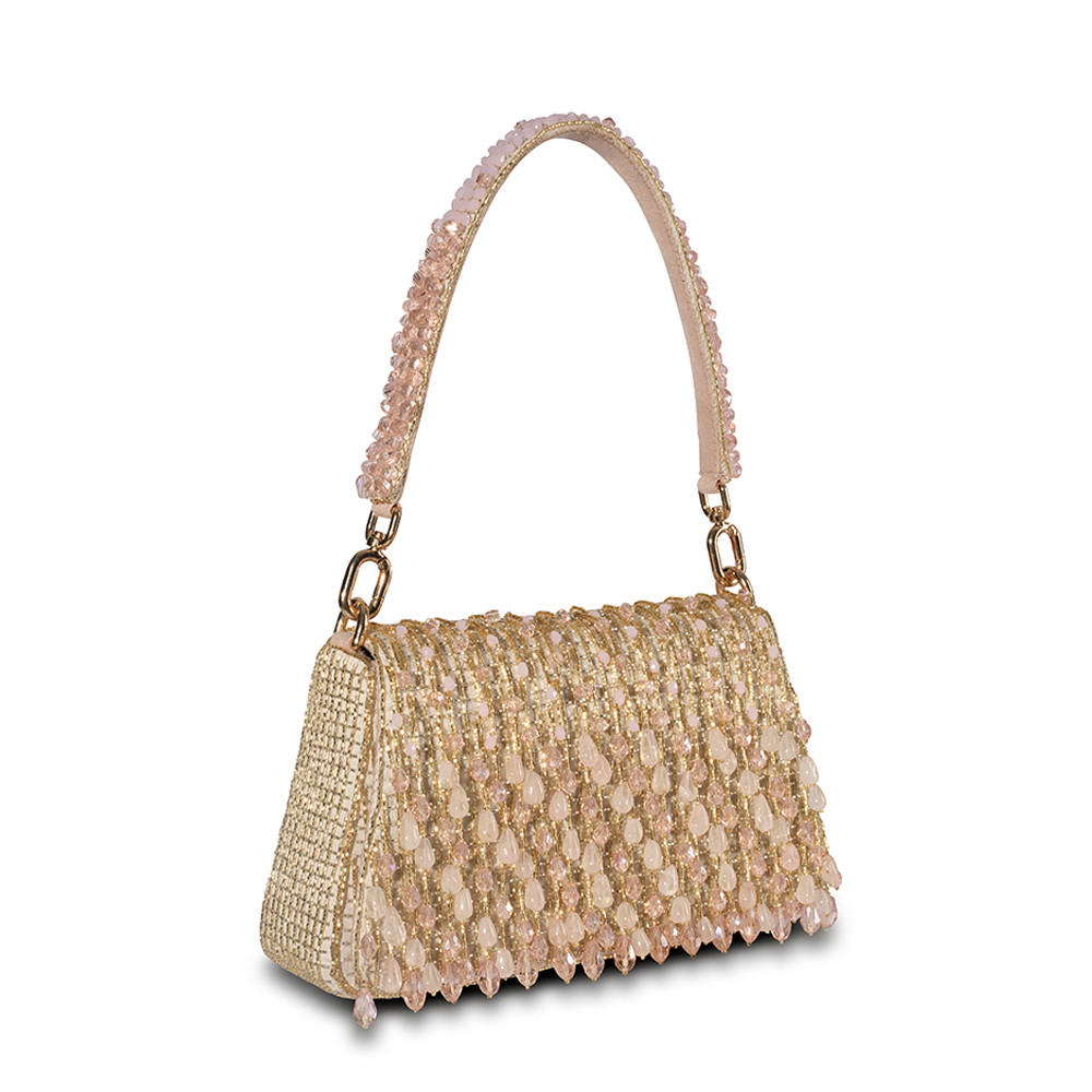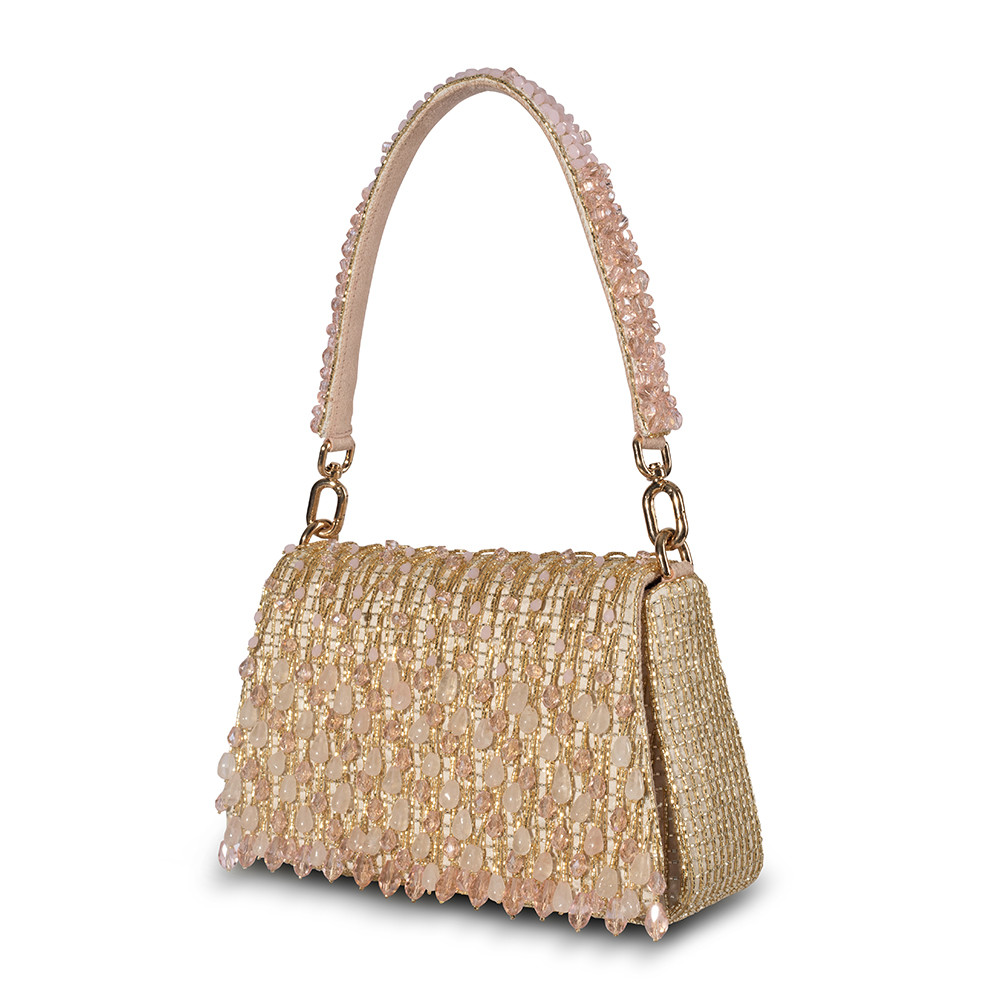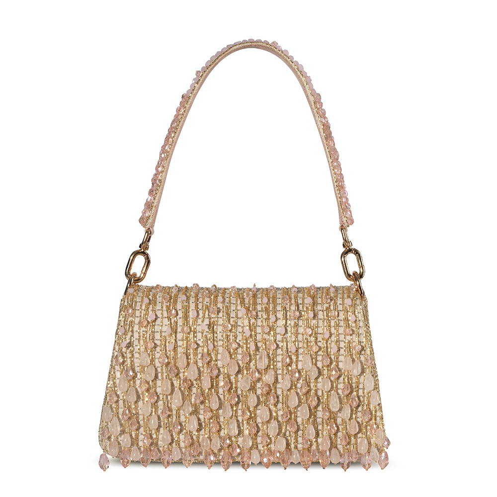 The Opal Medium Trapezium in Rose Quartz Pink features delicate hand-embroidery with semi-precious gems, precision cut Japanese microbeads, and crystals in a soft ombré design. The structured, angular shape brings modern elegance, and the detachable embellished top handle with a crossbody chain offers multiple ways to style it. Perfect for holding makeup, currency, cards, keys and a smartphone, and includes an inside slip pocket for easy organization.