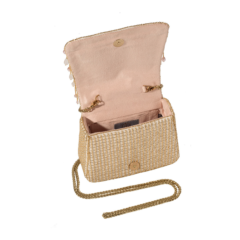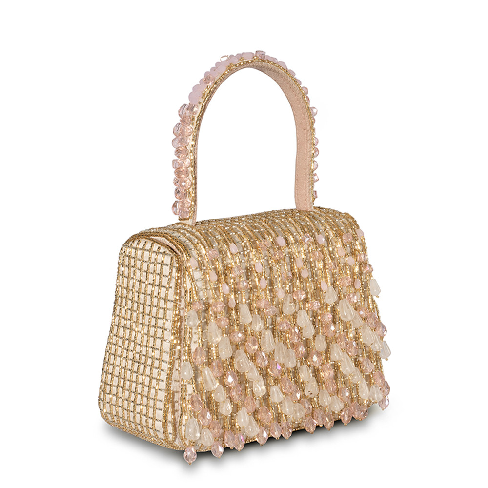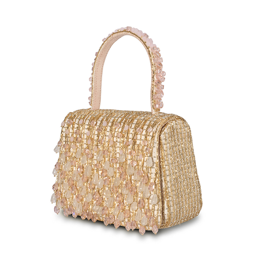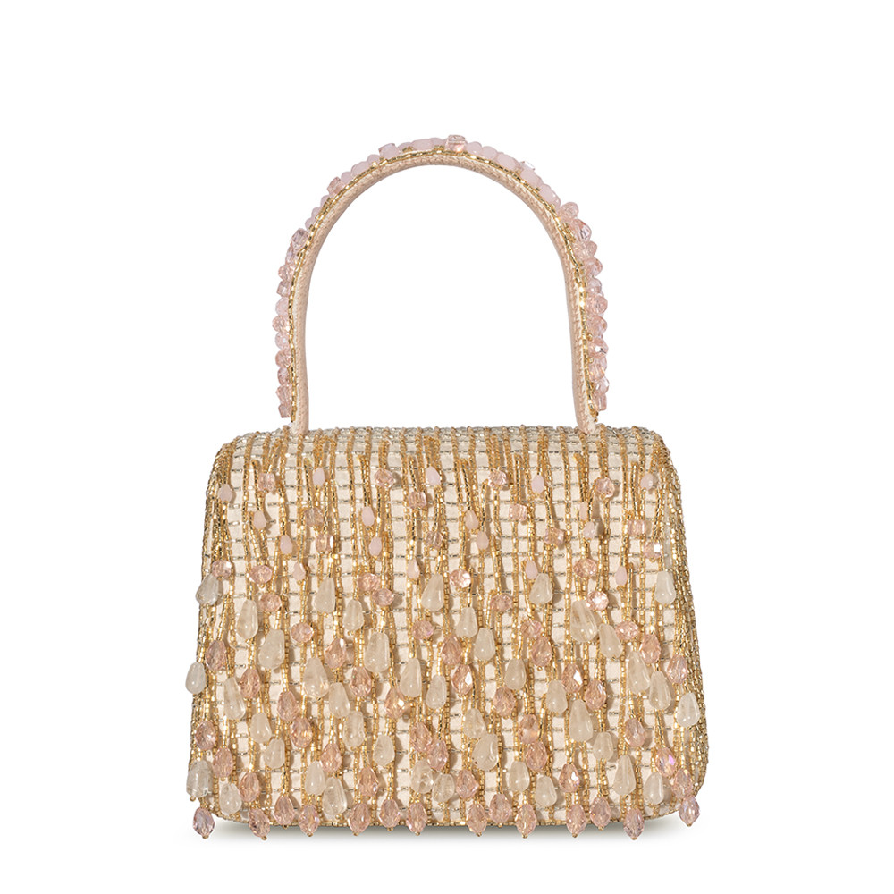 The Opal Mini Trapezium in Rose Quartz Pink features delicate hand-embroidery with semi-precious gems, precision cut Japanese microbeads, and crystals in a soft ombré design. It’s compact, structured shape adds a bold, modern edge, while the embellished top handle and a crossbody chain provide versatile styling options. Perfect for holding makeup, currency, cards and keys, and includes an inside slip pocket for easy organization.