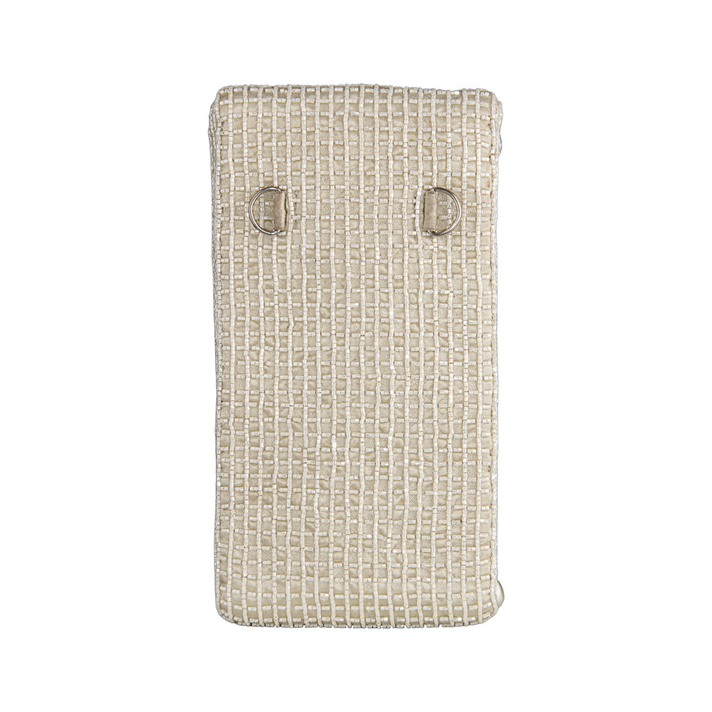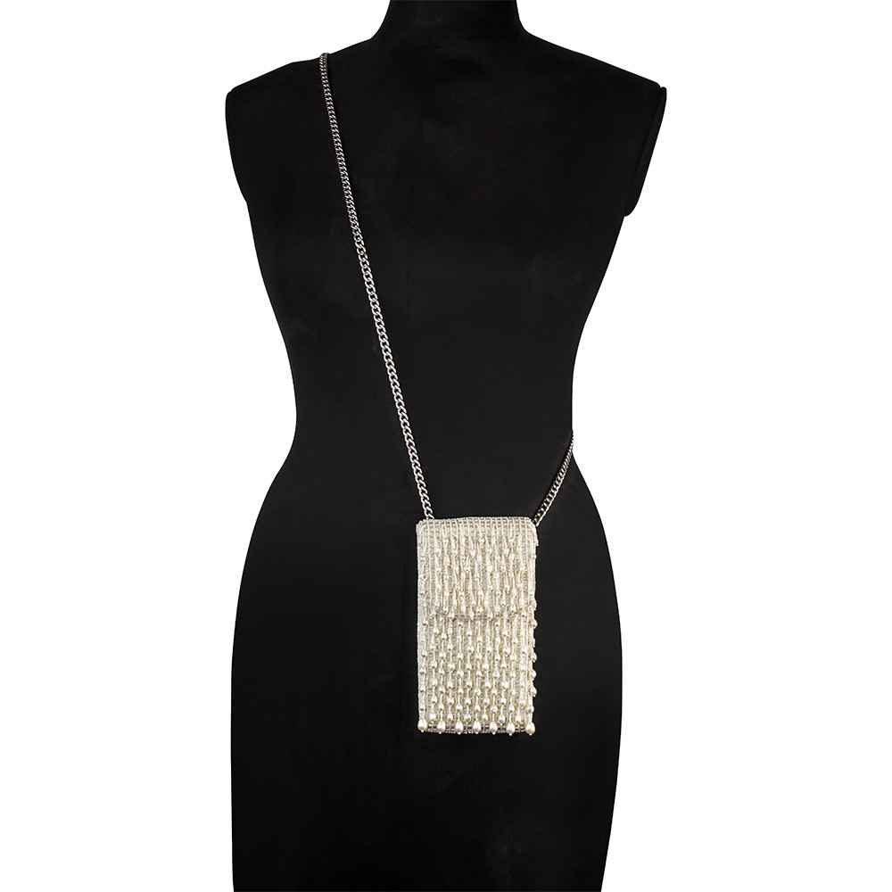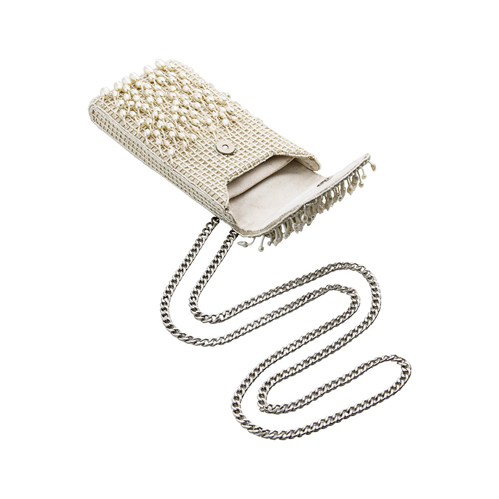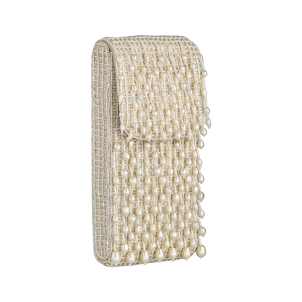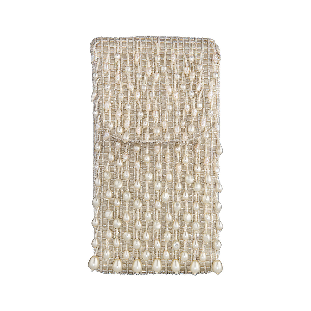 The Lovetobag Opal Mobile Pouch Ivory is a neomodern mini bag to carry your smartphone on the move. Embellished with an assortment of lustrous baroque pearls, Japanese micro beads & crystals. It has an ornate yet delicate look. This collectible statement accessory fits in your valuables like a smartphone and currency.
