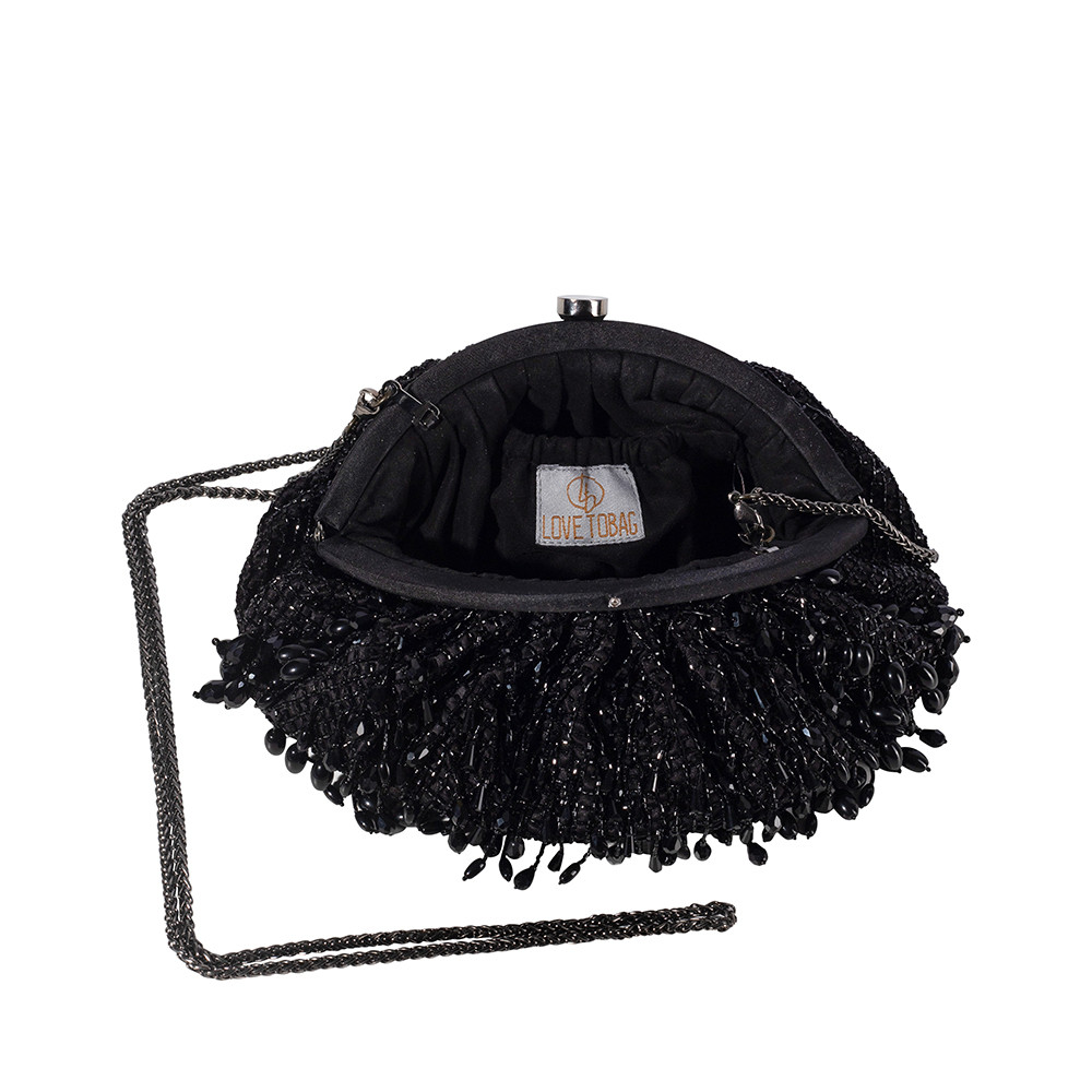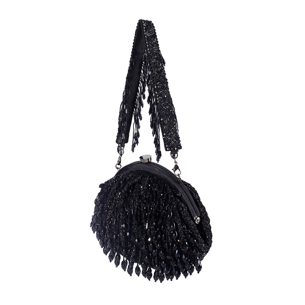 The Opal Soft Pouch in Heritage Black is decadently hand-embroidered with semi-precious gems, precision cut Japanese microbeads, and crystals, forming a striking ombré pattern. The intricate beads, resembling delicate droplets, capture the enchanting interplay of light and shadow. With a metallic clasp closure and a detachable embellished handle, this soft pouch combines elegance with functionality. A detachable chain allows for crossbody styling, making it perfect for holding makeup, currency, cards, keys and a smartphone, and includes an inside slip pocket for easy organization.