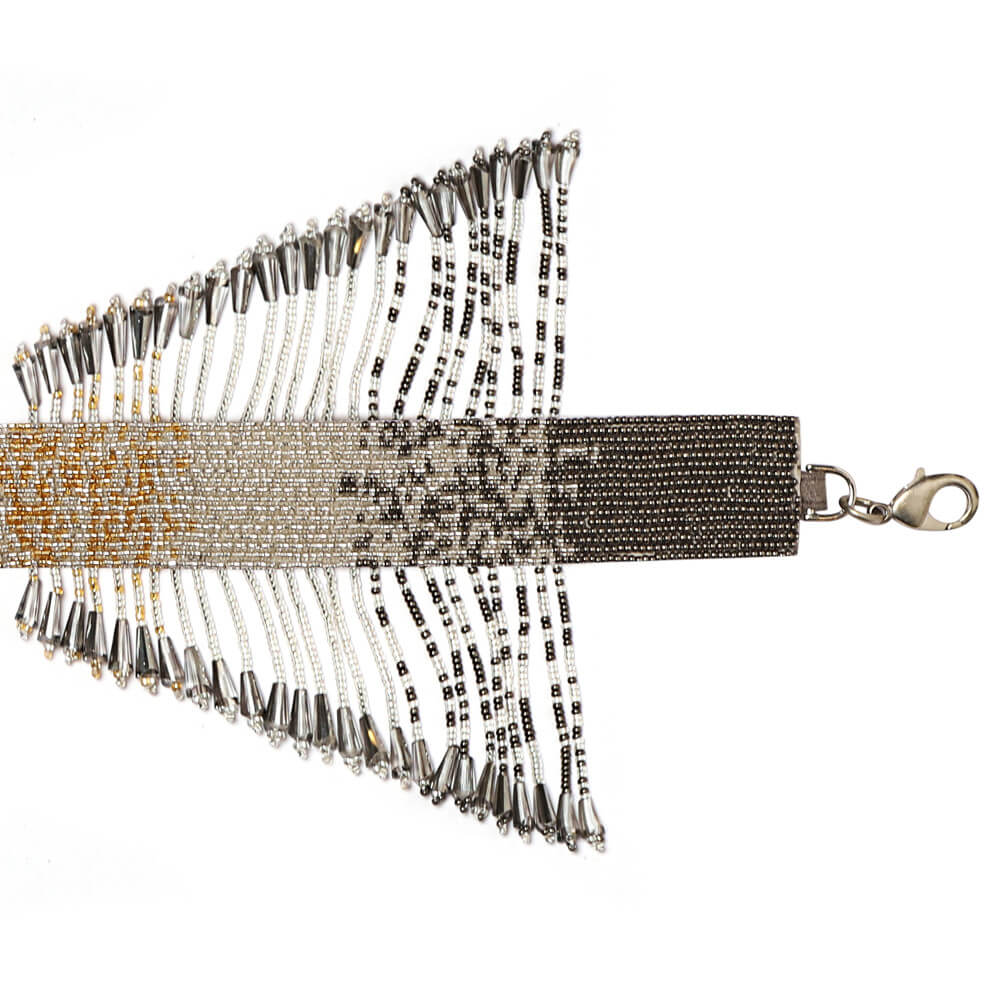 This signature feature handle is delicately hand embroidered with Japanese micro beads in an ombre pattern. It is a detachable statement add on that grants versatility to any heirloom bag , enabling the opportunity to wear the bag in multiple ways or take it from day to night. With detachable doghooks on both ends, the glittering radiance of the crystal tassels augments the playful & youthful demeanour of any bag.