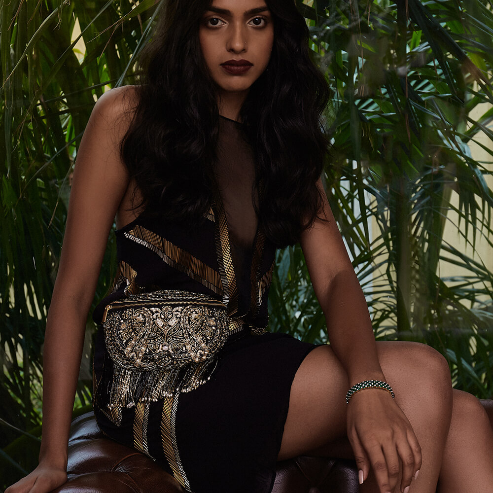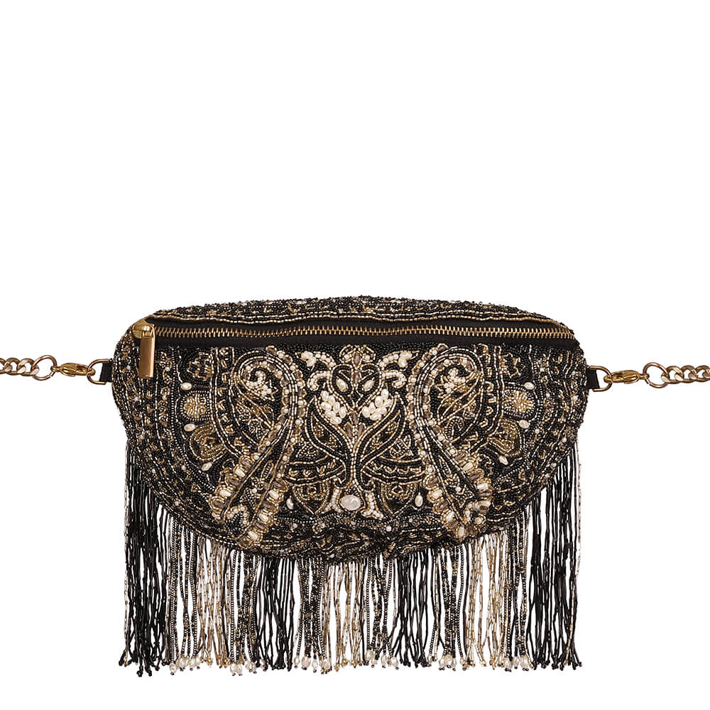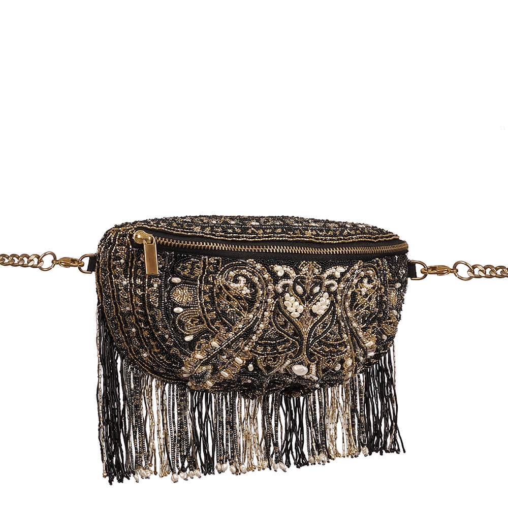 This eclectic waist pouch is sumptously hand embroidered with luminous Japanese micro beads, glass crystals & baroque pearls. Inspired by heritage Kashmiri kanikar shawls, Indian North Eastern stripe weaves & French pashmina designs, this is a timeless piece. Exuding sartorial flair, this 90’s inspired ruched waist pack can also be worn as a cross body bag. Spacious, free size & with hand beaded tassels this hands free silhouette is perfect for a day to night look.