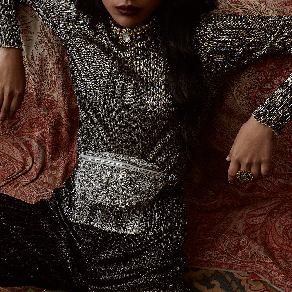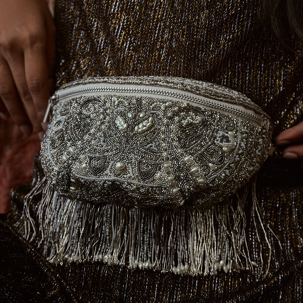 This eclectic waist pouch is sumptously hand embroidered with luminous Japanese micro beads, glass crystals & baroque pearls. Inspired by heritage Kashmiri kanikar shawls, Indian North Eastern stripe weaves & French pashmina designs, this is a timeless piece. Exuding sartorial flair, this 90’s inspired ruched waist pack can also be worn as a cross body bag. Spacious, free size & with hand beaded tassels this hands free silhouette is perfect for a day to night look.